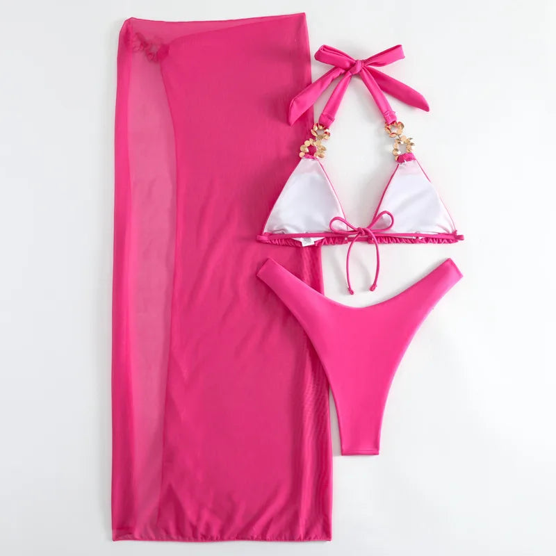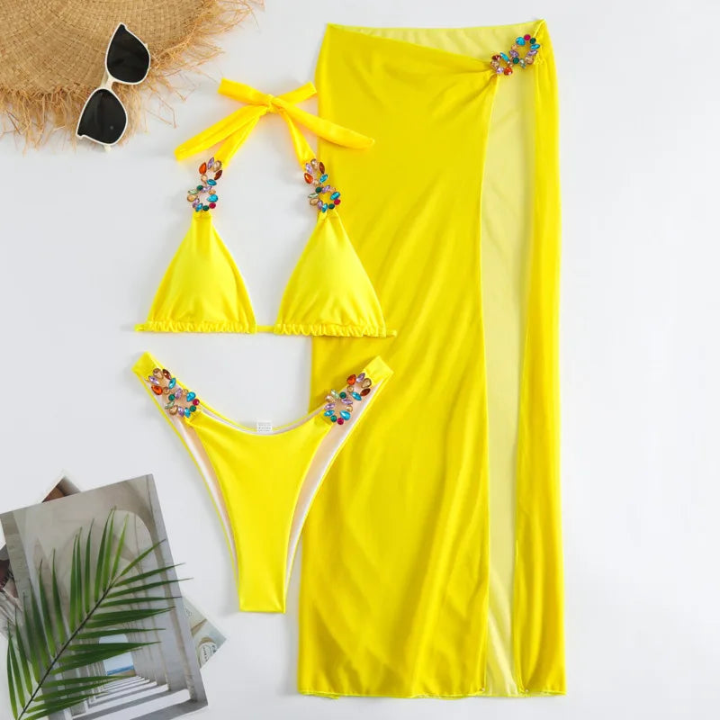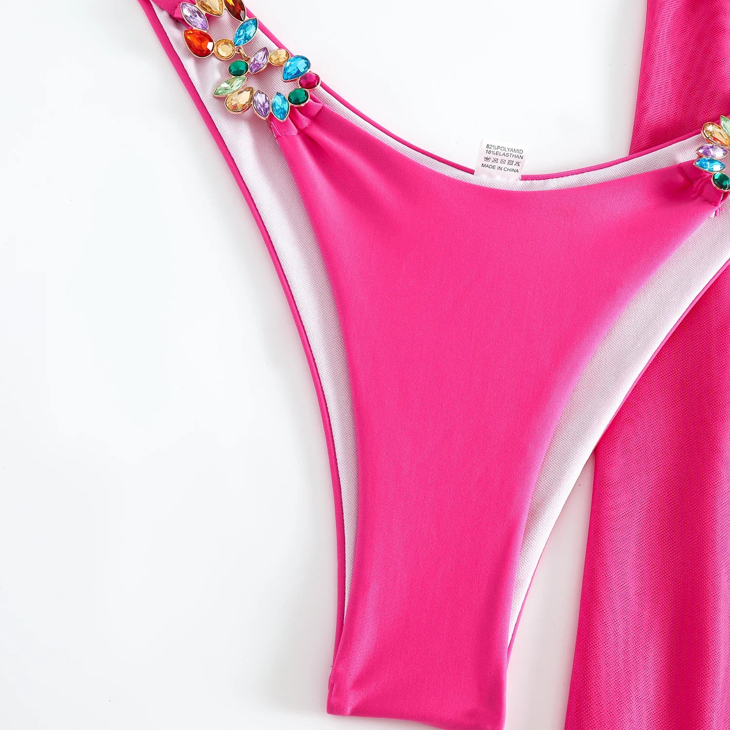 - Design features: Triangle bikini top with a halter-style neckline and sleeveless design. The high-cut bikini bottom sits high on the hip. Both the top straps and bottom hip-side seams feature colorful, multi – stone embellishments.