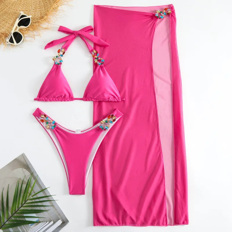 This two-piece bikini is a vibrant addition to your swimwear collection. With its solid vibrant pink color and jewel accents, it offers a bold and glamorous look, perfect for beach and poolside settings.
