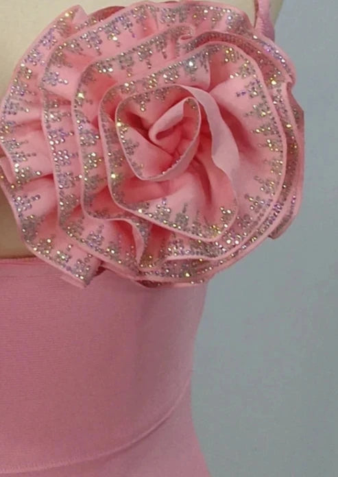 - Flower Appliqués: Two large, voluminous 3D roses on the chest with ruffled fabric and glittering trim