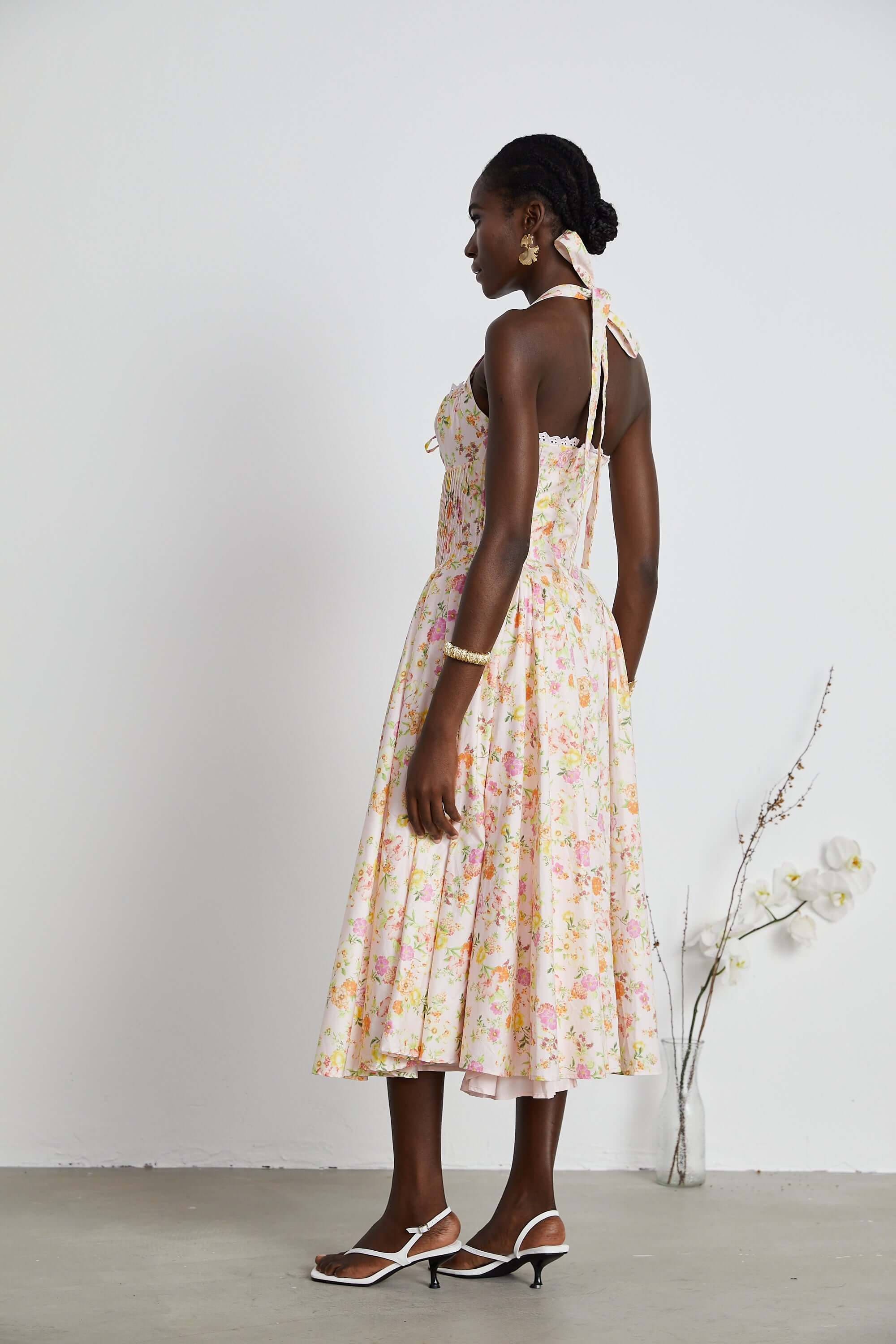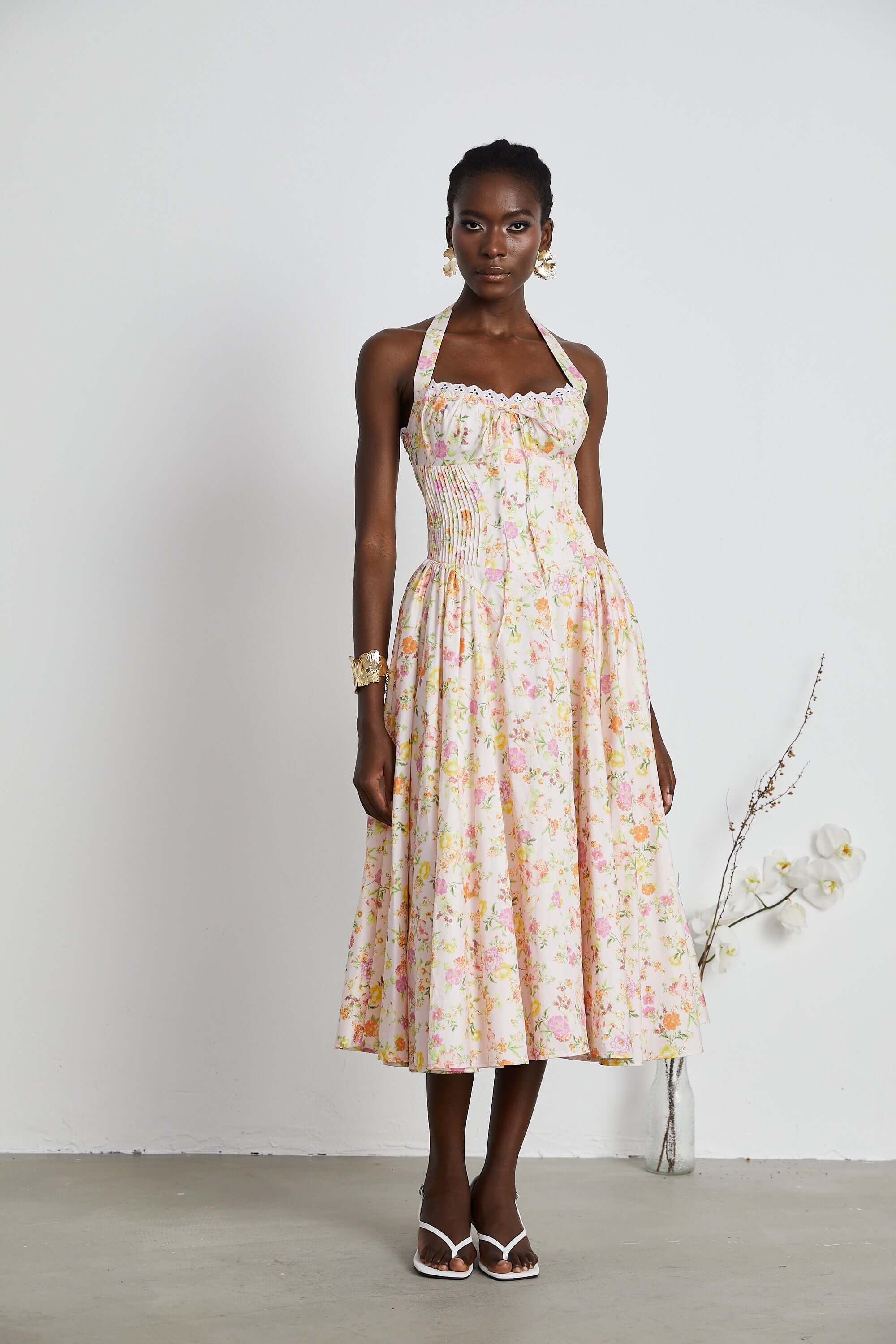 Step into summer with this charming vintage-inspired midi dress. It features a corset-style bodice and a flared skirt, offering a flattering silhouette. Ideal for warm-weather occasions, it combines style and comfort.