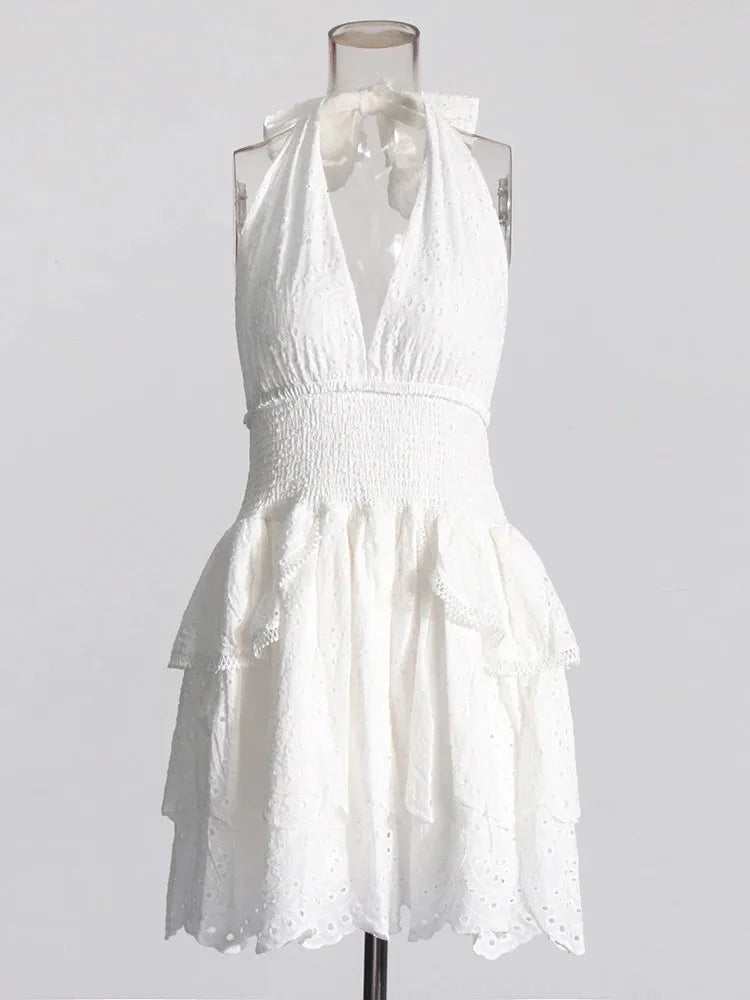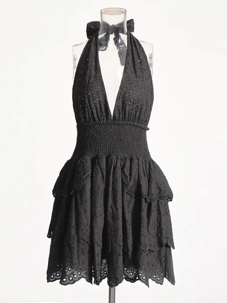 This luxury women’s party mini dress is a perfect blend of elegance and playfulness. It features a halter neck and an open back, adding a touch of glamour. The tiered ruffled skirt and decorative details make it ideal for formal events and special occasions.