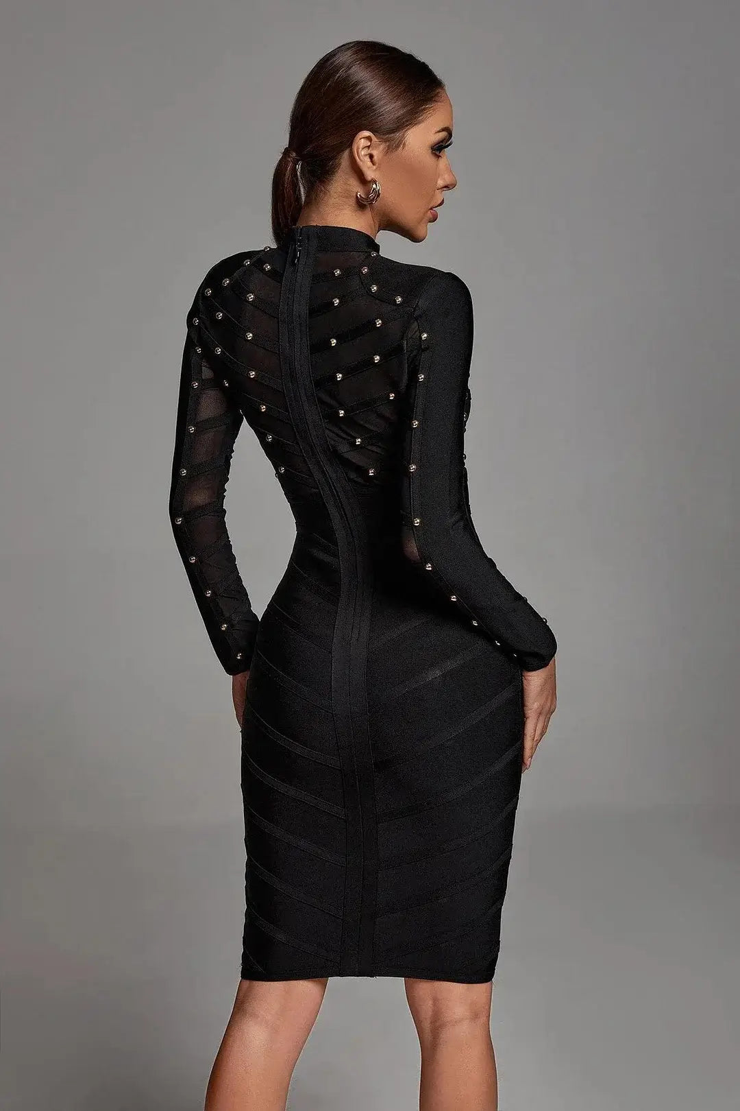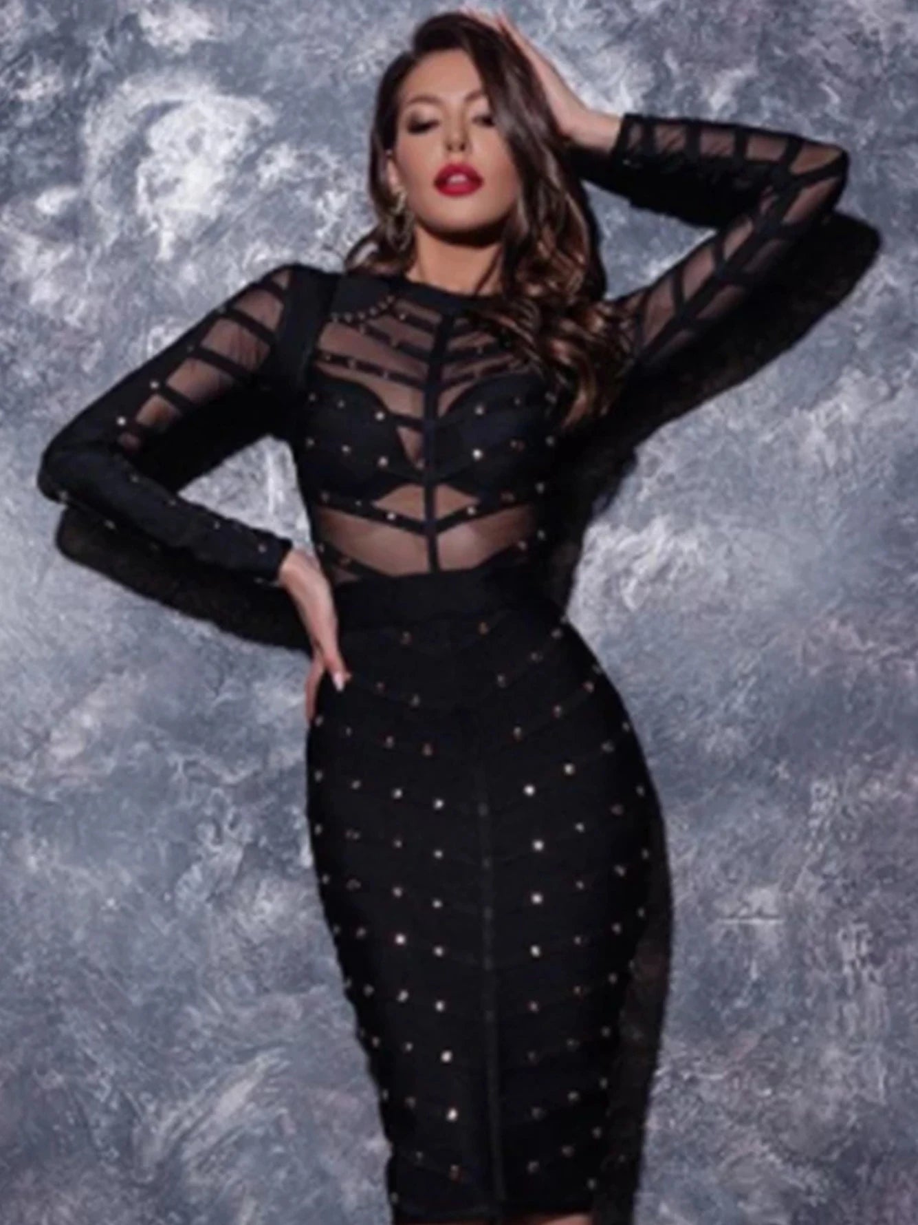 - Long Sleeves: Sheer mesh with grid/strappy cutouts and studded details
