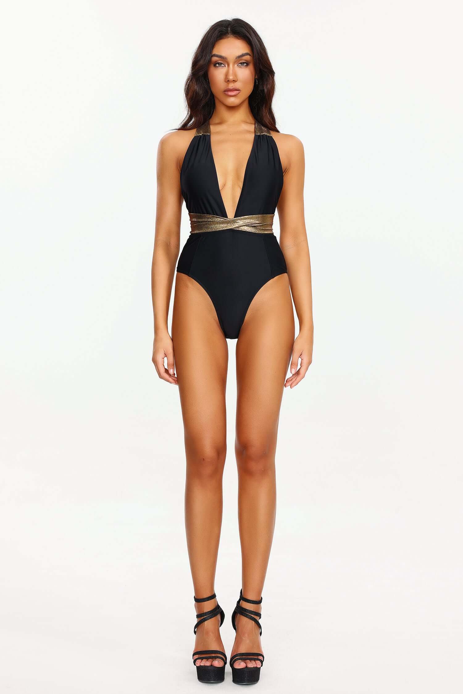 - Waist Detail: Wide gold band wrapped around the midsection