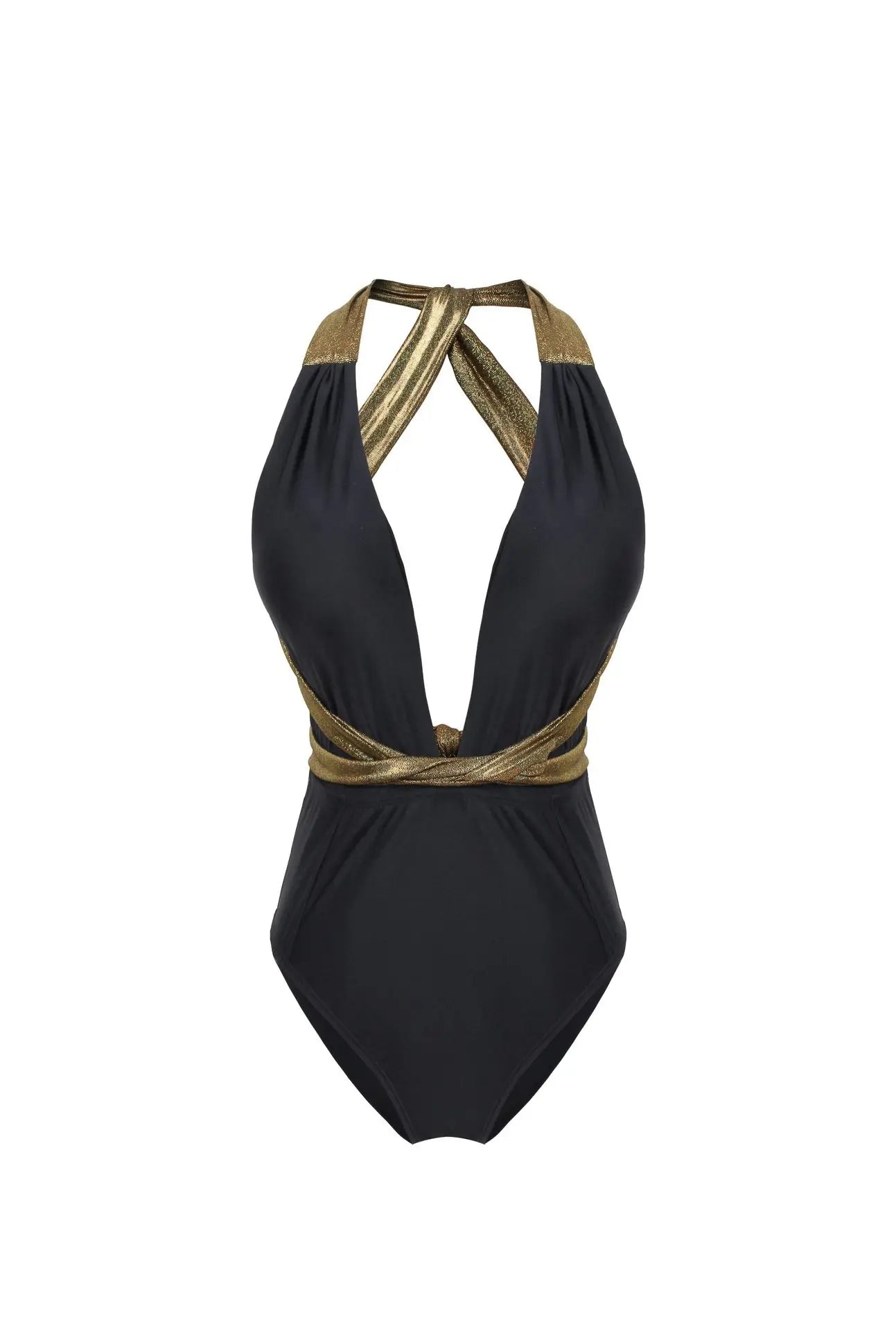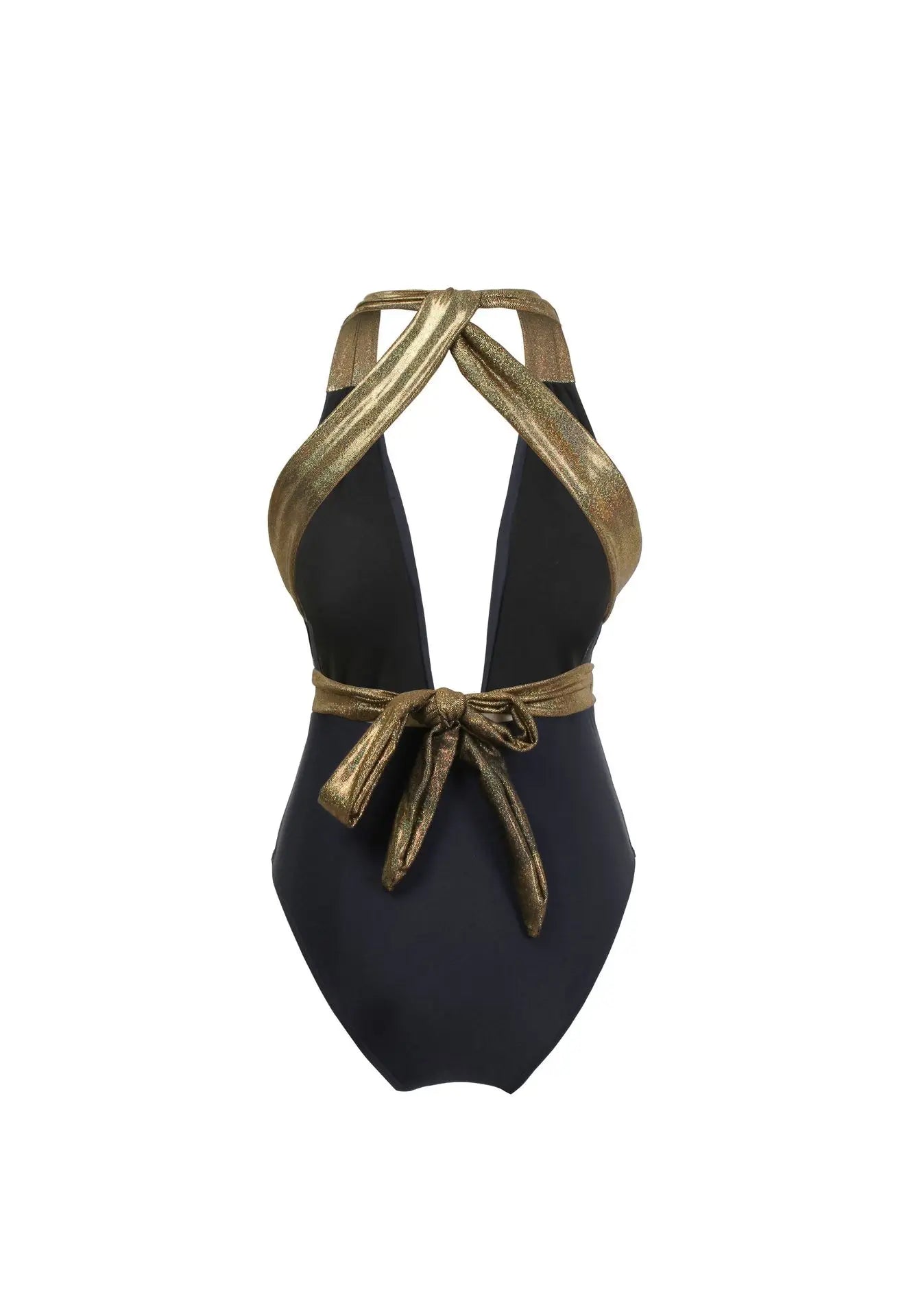 - Straps: Halter – style with crisscrossing gold trim