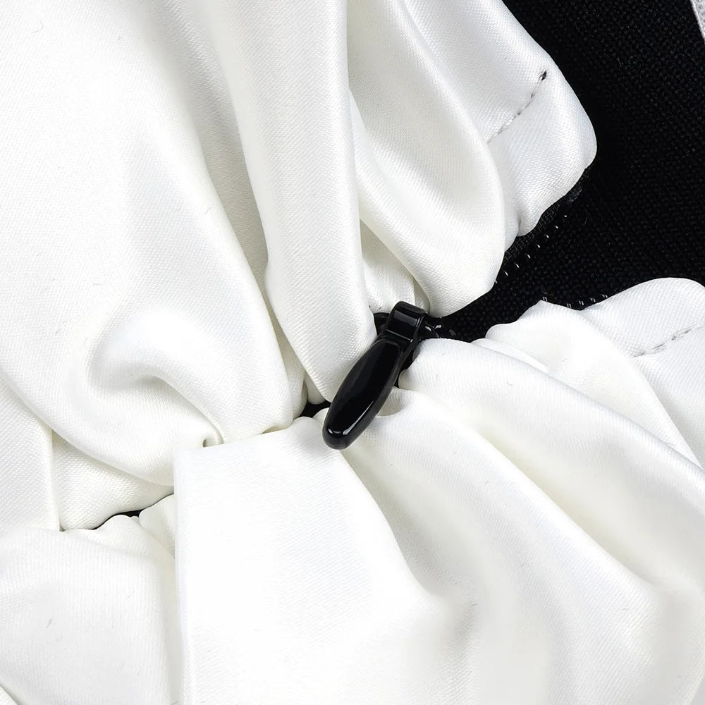 - Fabric characteristics: The white fabric is a smooth, glossy satin or synthetic satin, while the black sections are a mesh/netting with a matte texture and slight sheen.