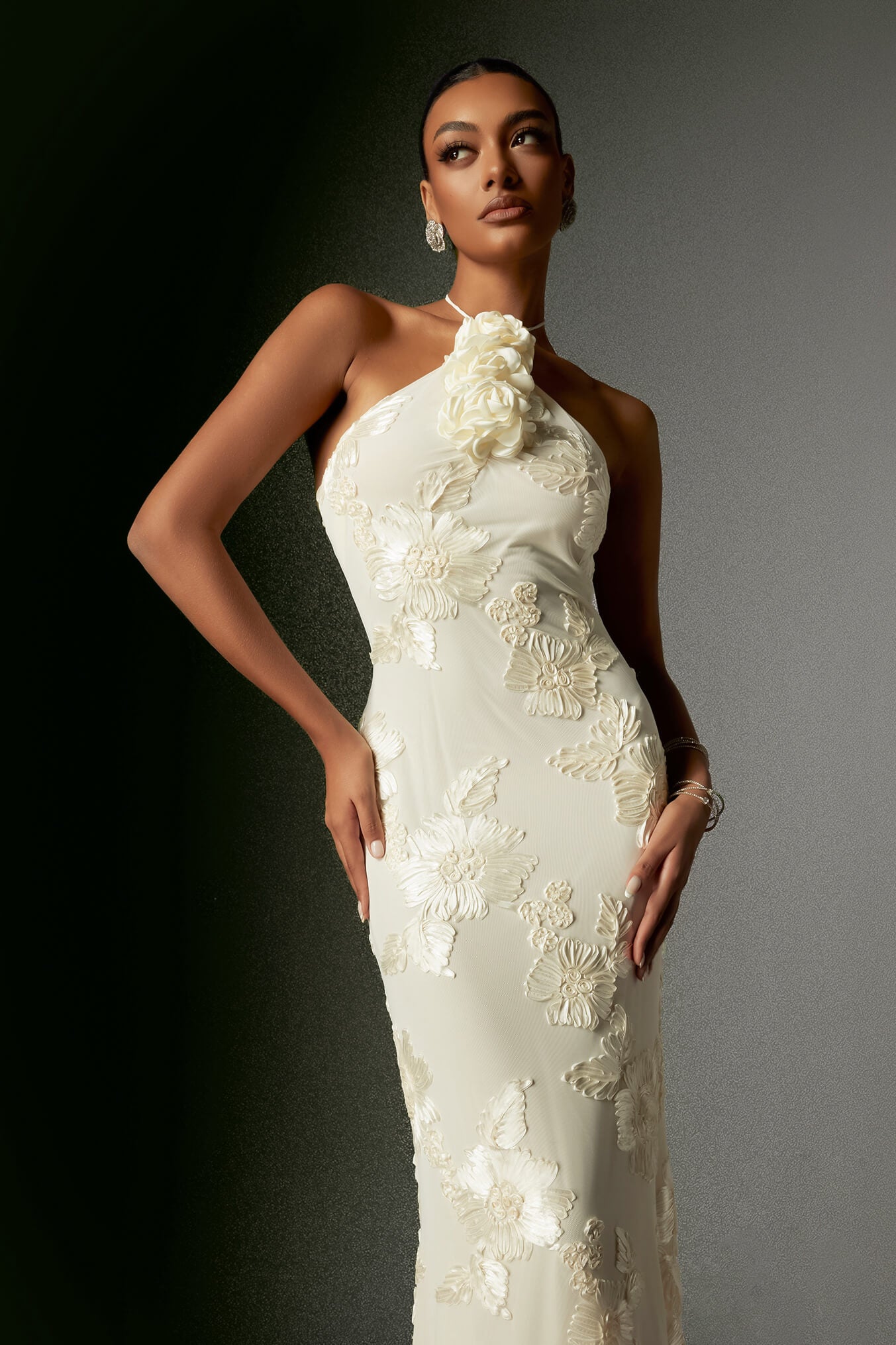This formal evening dress is a perfect choice for special occasions. It features a form – fitting silhouette that accentuates the figure, along with elegant 3D floral appliqués that add a touch of luxury and sophistication.