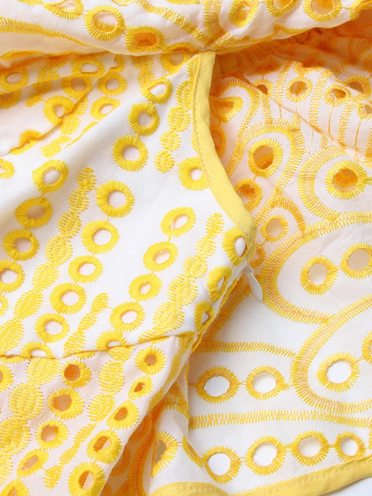- Eyelet/Embroidered Patterns: Circular holes and decorative stitching