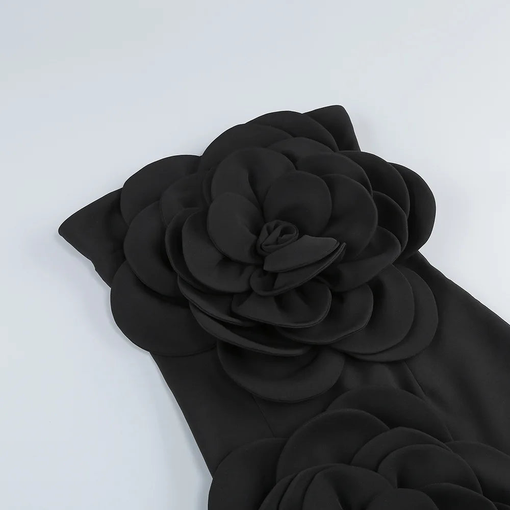 This stunning mini dress in a vibrant crimson red is a showstopper. The solid red base is adorned with large 3D sculptural floral appliqués, creating a bold and couture-like effect. Its structured fabric and bodycon fit accentuate your curves elegantly.