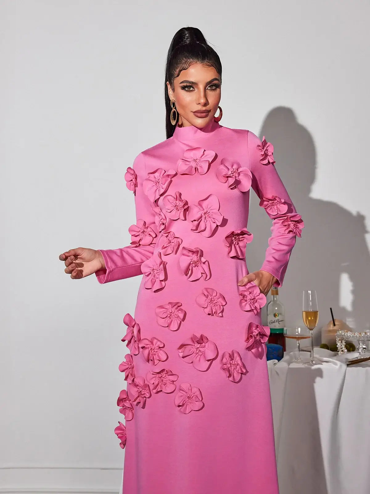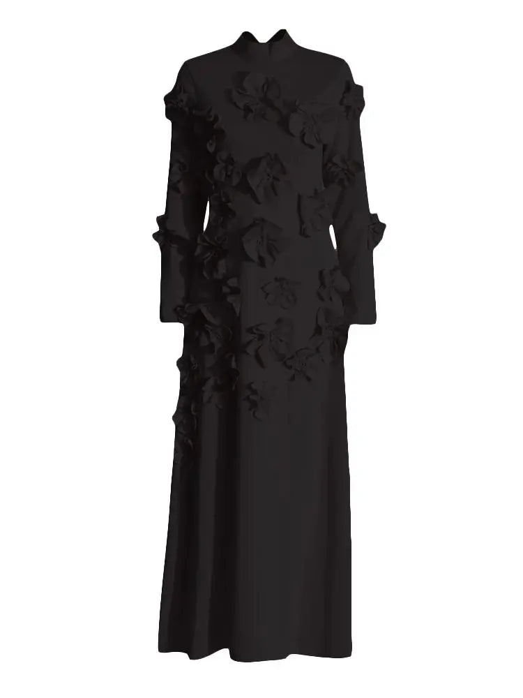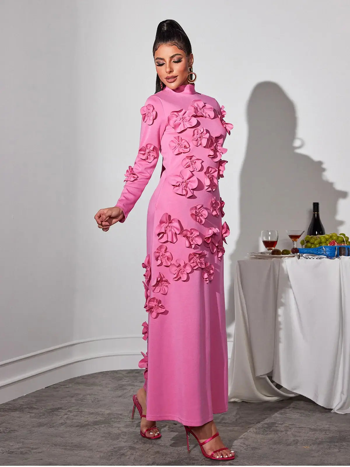 Indulge in elegance with this exquisite maxi dress. Its form-fitting design and 3D floral appliqués offer a romantic and sophisticated look, perfect for formal events. The smooth and stretchy fabric ensures both comfort and style.
