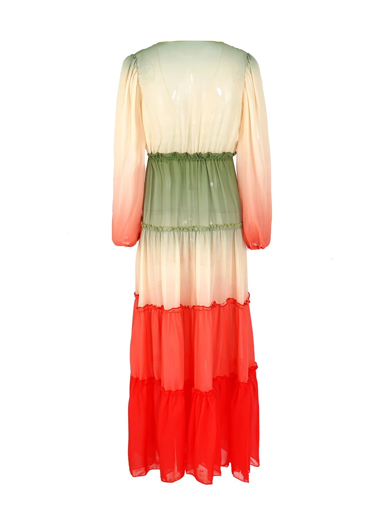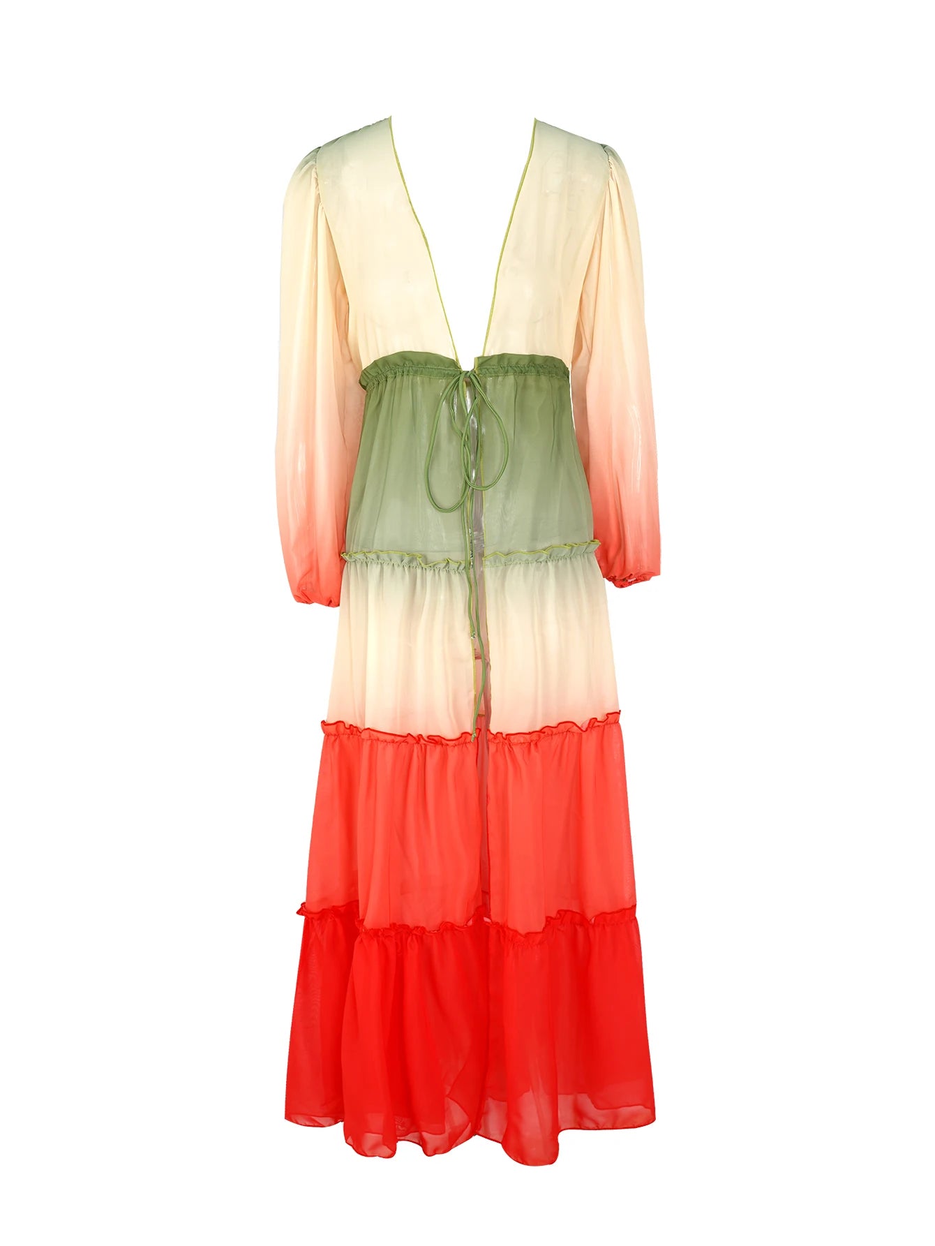 Embrace the bohemian-chic style with this stunning midi dress. It features a vibrant color-blocking design with red, cream/ivory, and sage green panels, along with charming ruffled trims that add a playful touch. The lightweight, flowing fabric ensures comfort and a summery vibe.