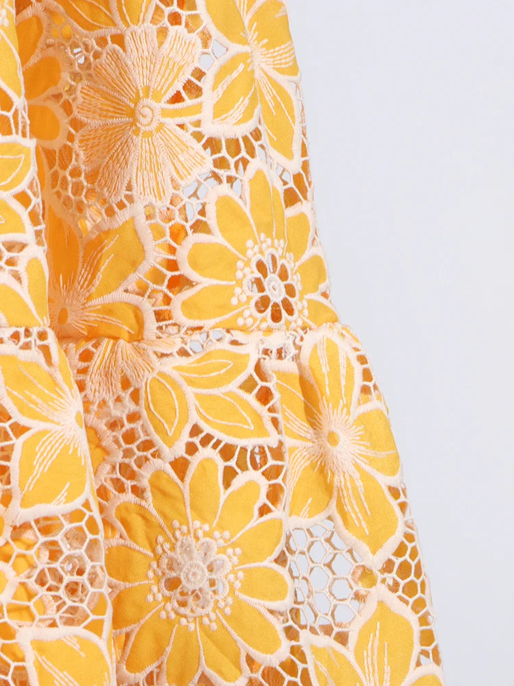 - Design features: Halter neck with crisscross thin straps and lace trim, sleeveless, A – line hemline, midriff cutouts on the sides of the bodice, and intricate white lace trim along the neckline and the lower edge of the bodice cutouts.