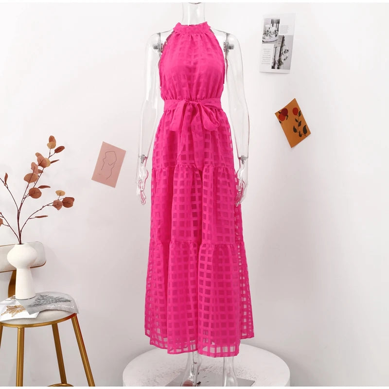 - Design features: High neck with halter-style silhouette, sleeveless, tiered A-line hemline, self-tie sash at the waist, tiered ruffled/gathered layers on the skirt