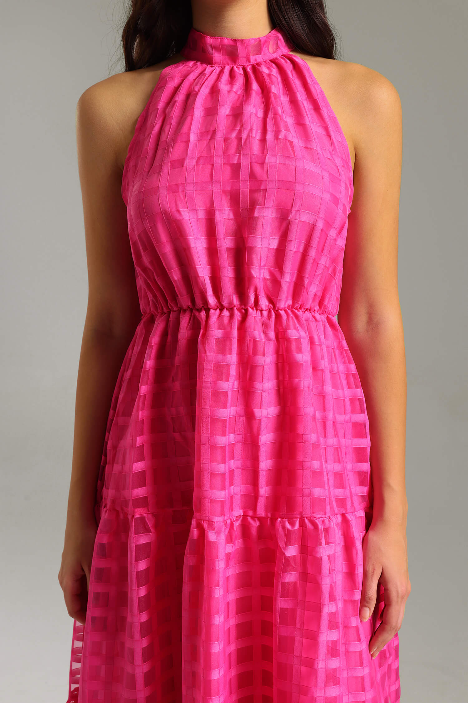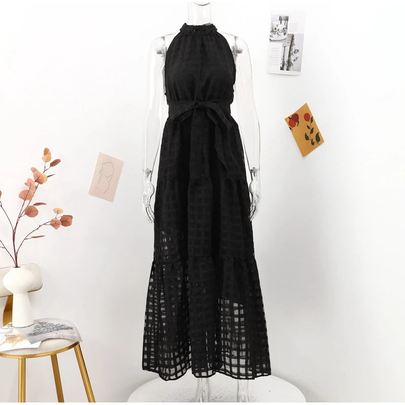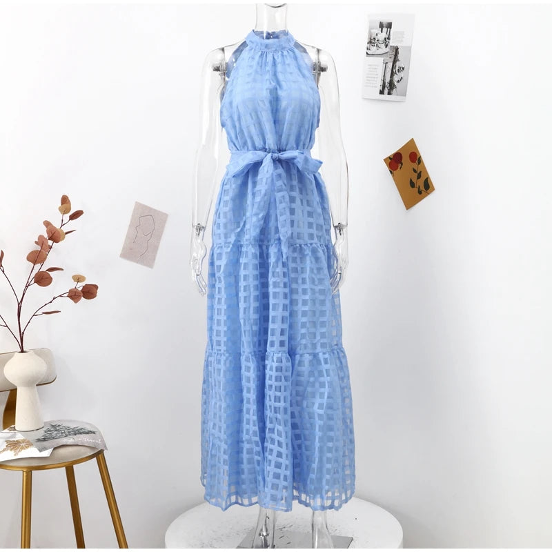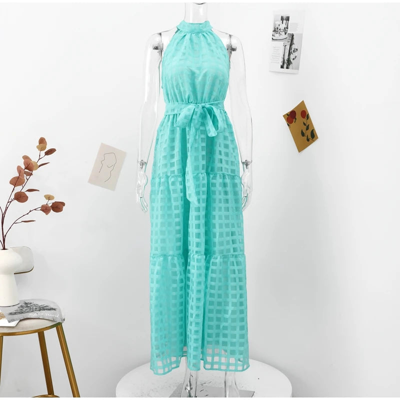 - Neckline: Halter-style with a high neck and a tie/knot at the back