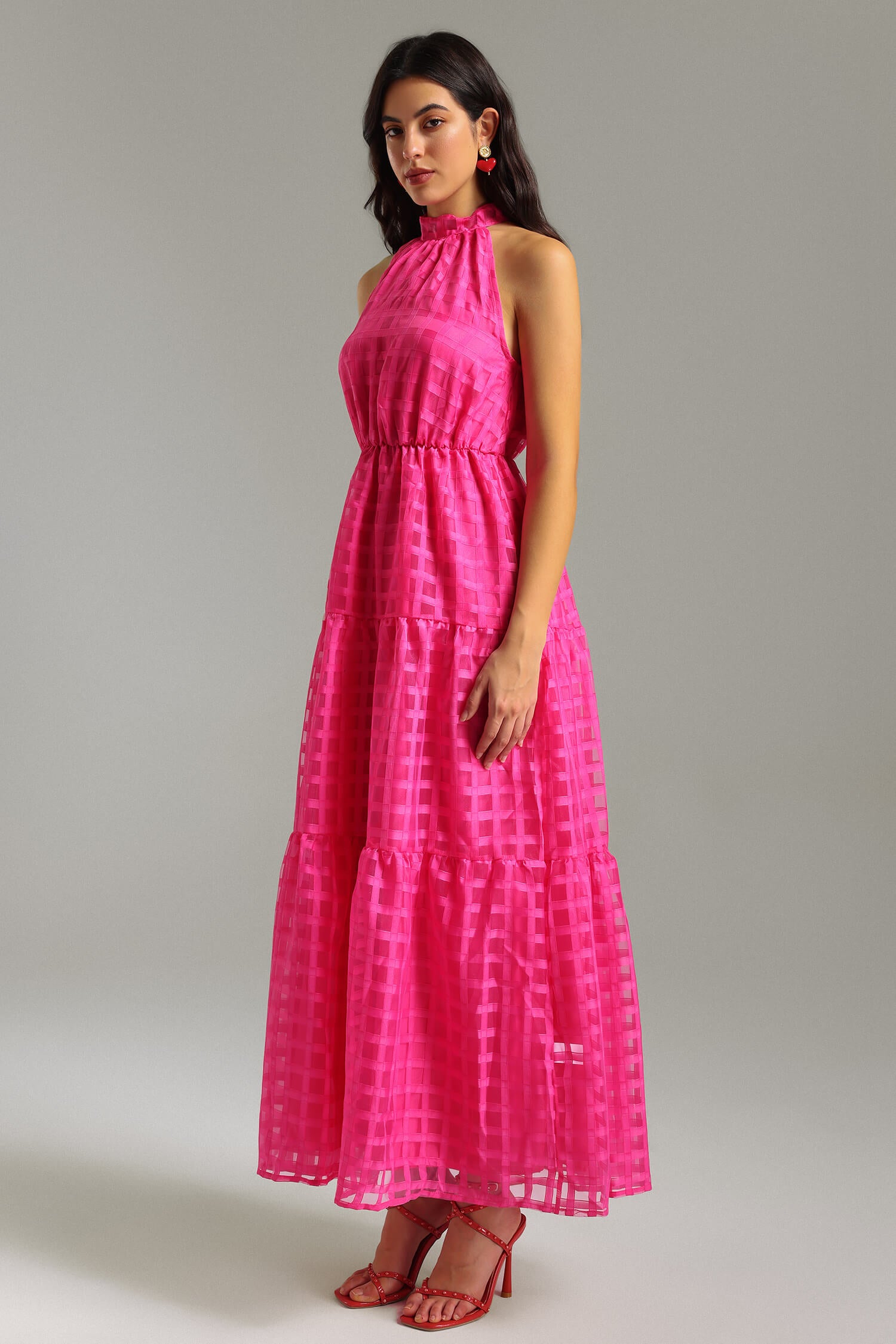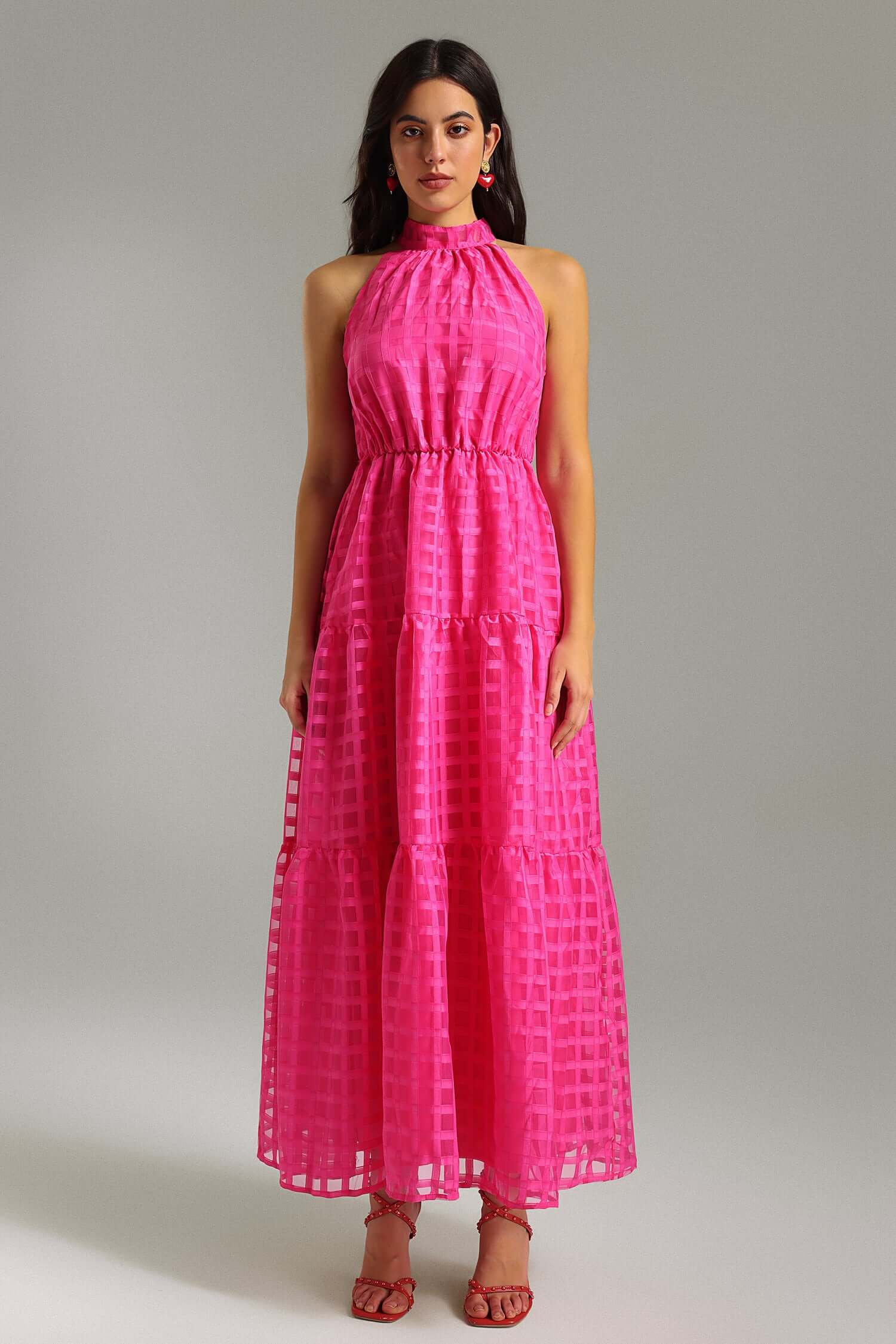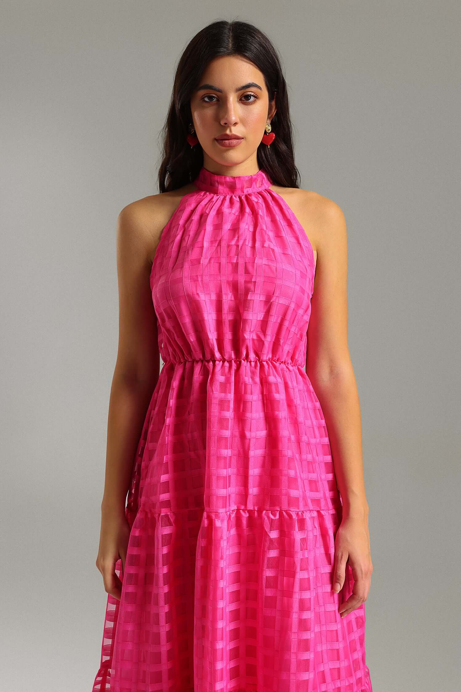 - Neckline: Halter-style with a high neck and a tie/knot at the back
