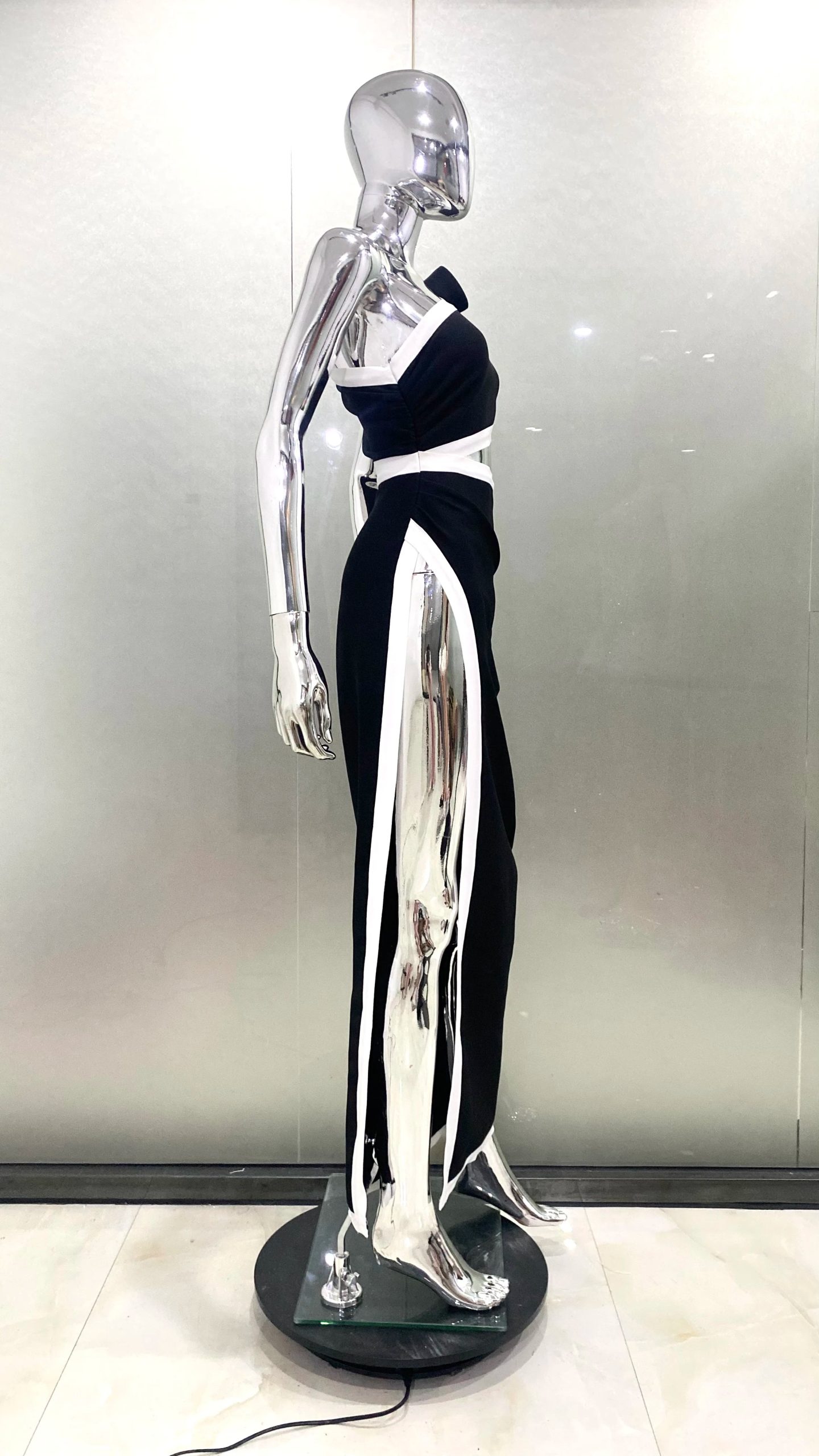 This formal maxi dress makes a bold statement with its sleek black base and striking white accents. The one-shoulder neckline and high side slit add a touch of drama, while the crop-top cut-out at the midriff exudes modern sophistication. It’s the perfect choice for high-end evening events.