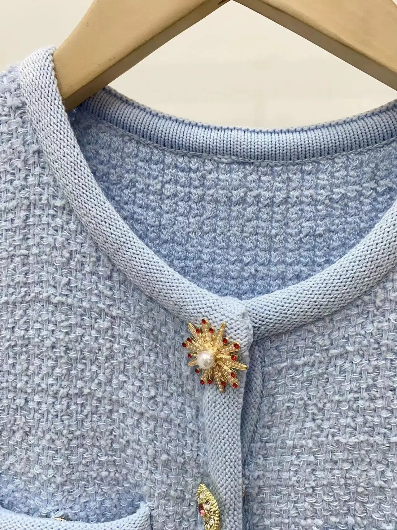 • Design features: Round neck with ribbed knitted trim, decorative starburst brooch as a focal button, functional buttons on the front placket, tailored hemline