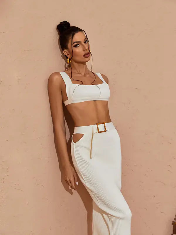 - Bottoms Style: High – waisted, form – fitting with side cut – out