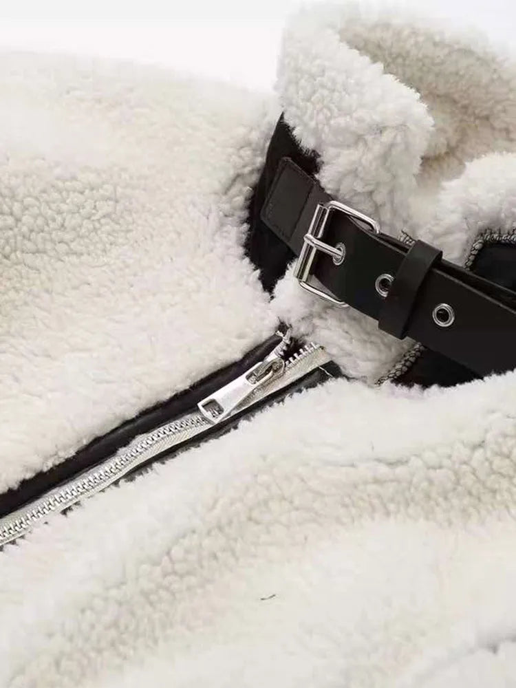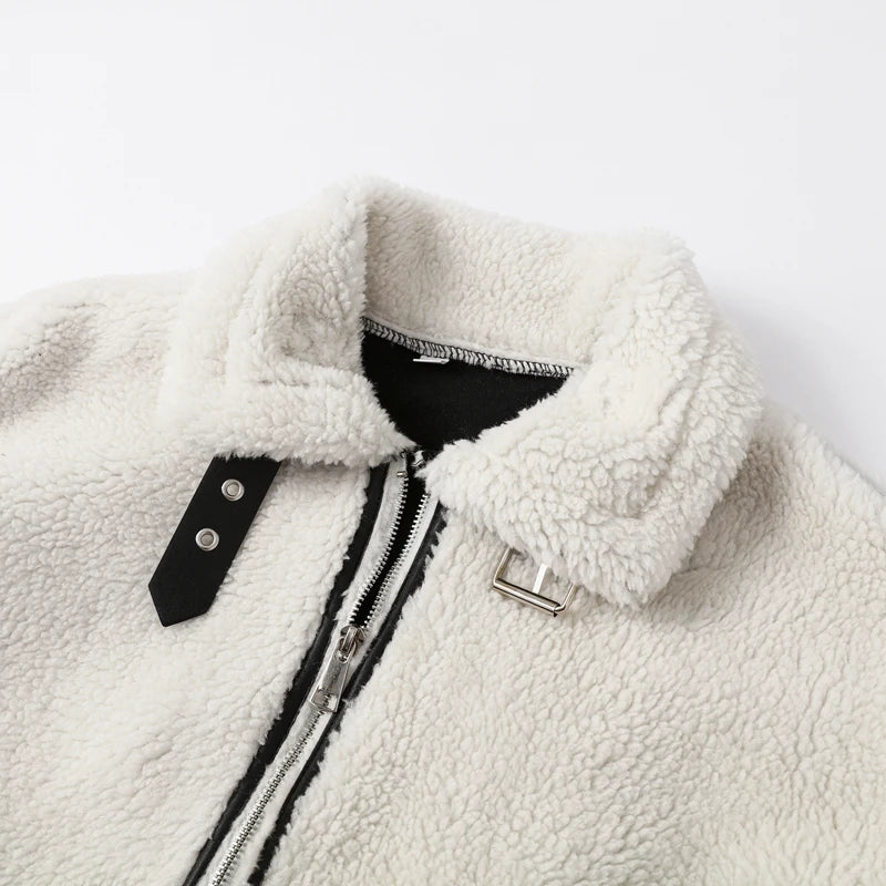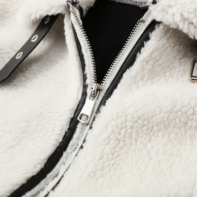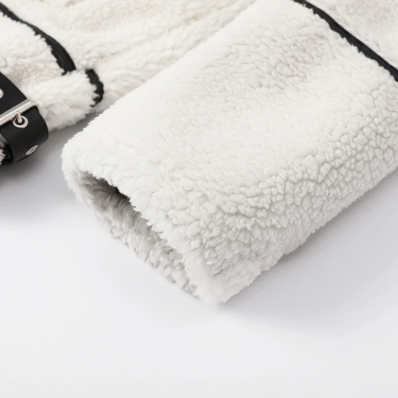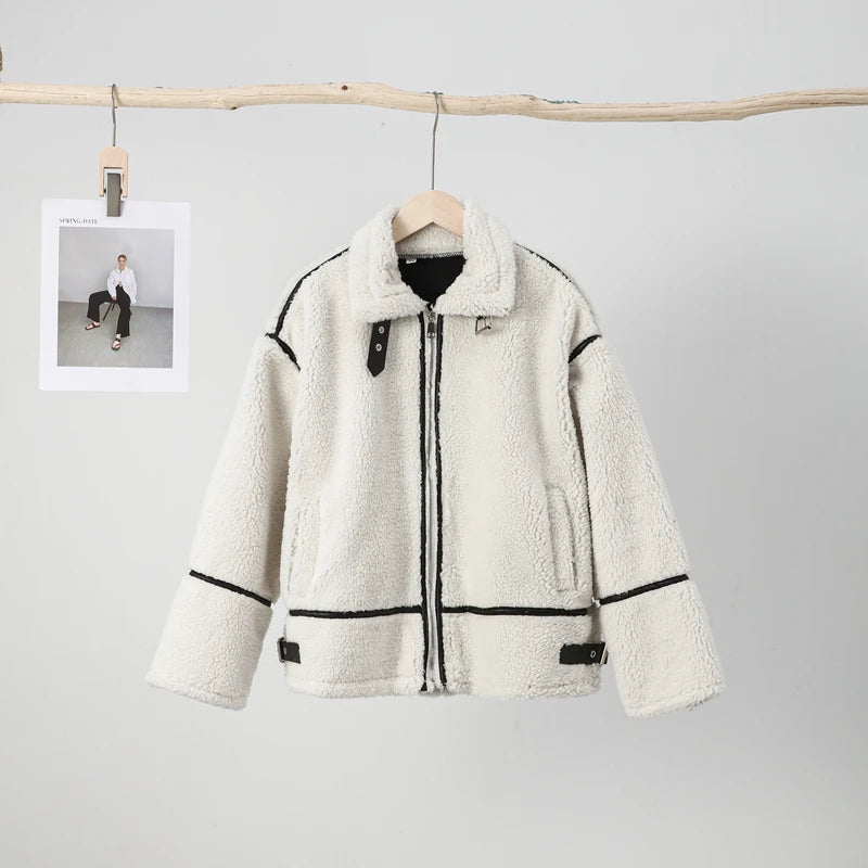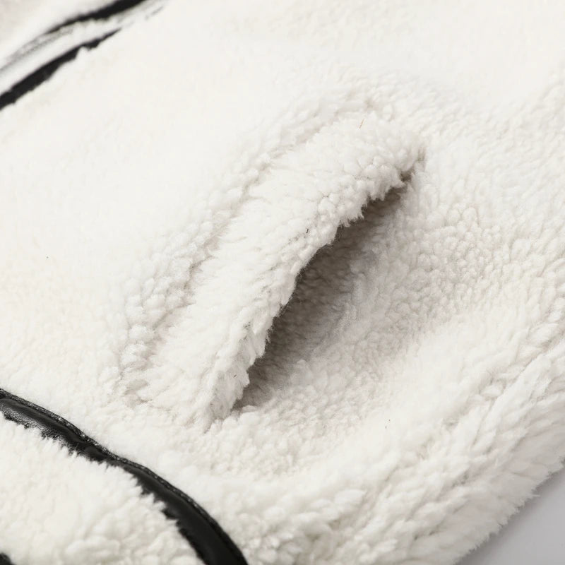 Embrace the cozy and trendy style with this white faux shearling jacket. Featuring black contrast piping and a sleek zipper closure, it combines comfort with modern fashion. The stand – up fur – lined collar adds a touch of casual elegance.