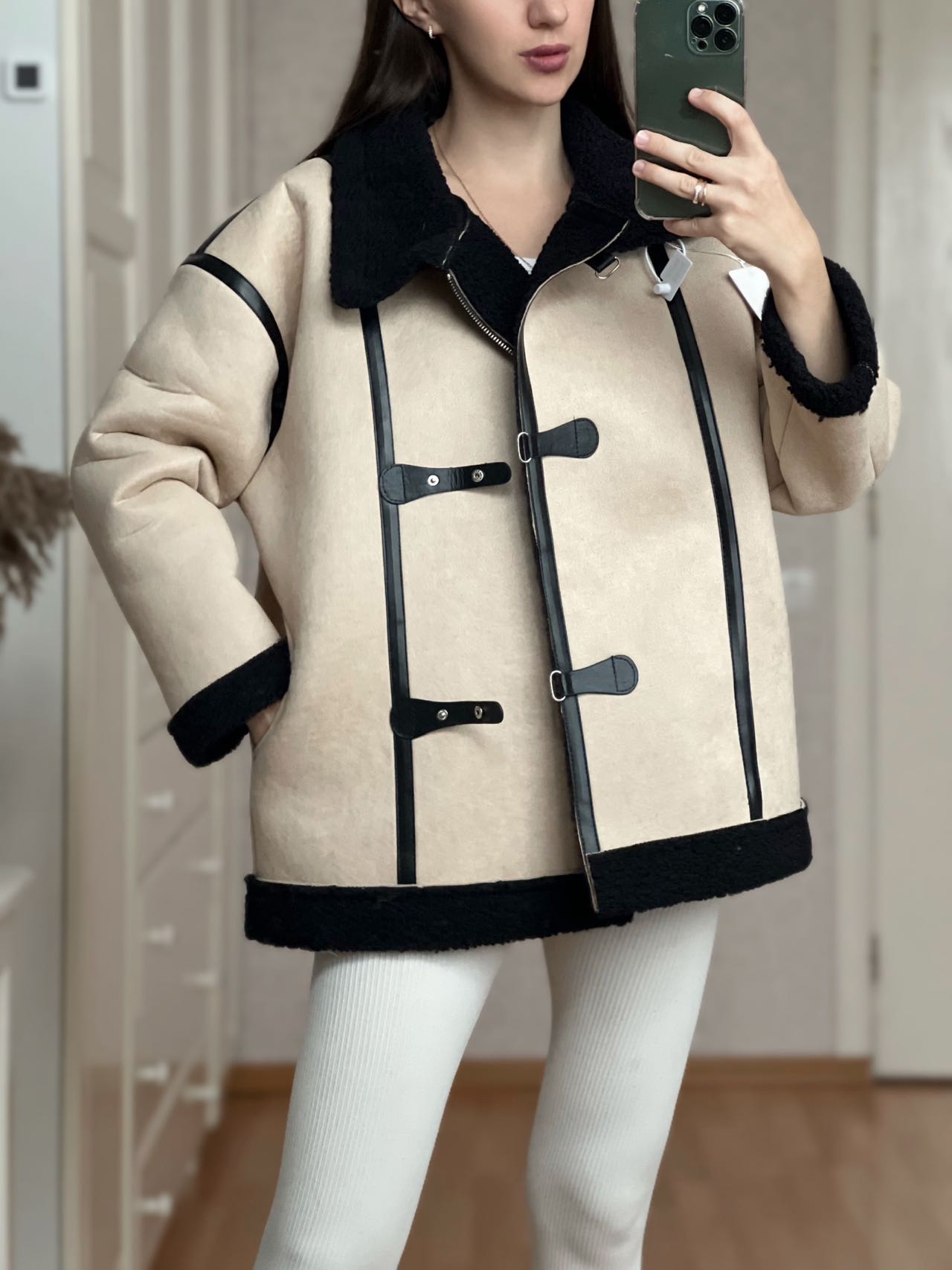 - Design features: High stand-up collar trimmed with black faux fur, long sleeves with black faux fur cuffs, black faux leather straps with metallic snap-buckles, and a front zipper closure.