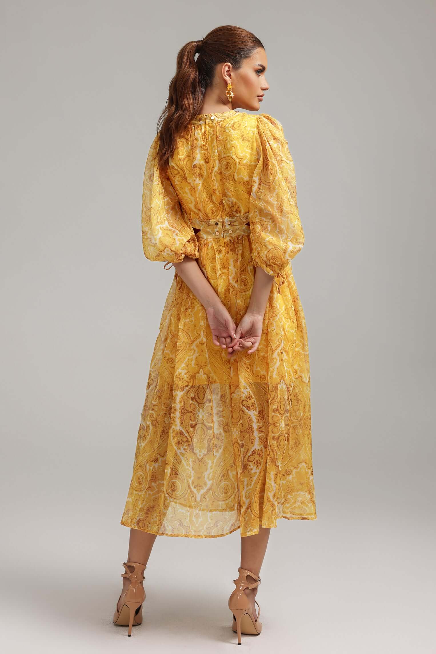 - Sleeve Details: Puffed, voluminous sleeves with elasticized cuffs and small drawstring ties