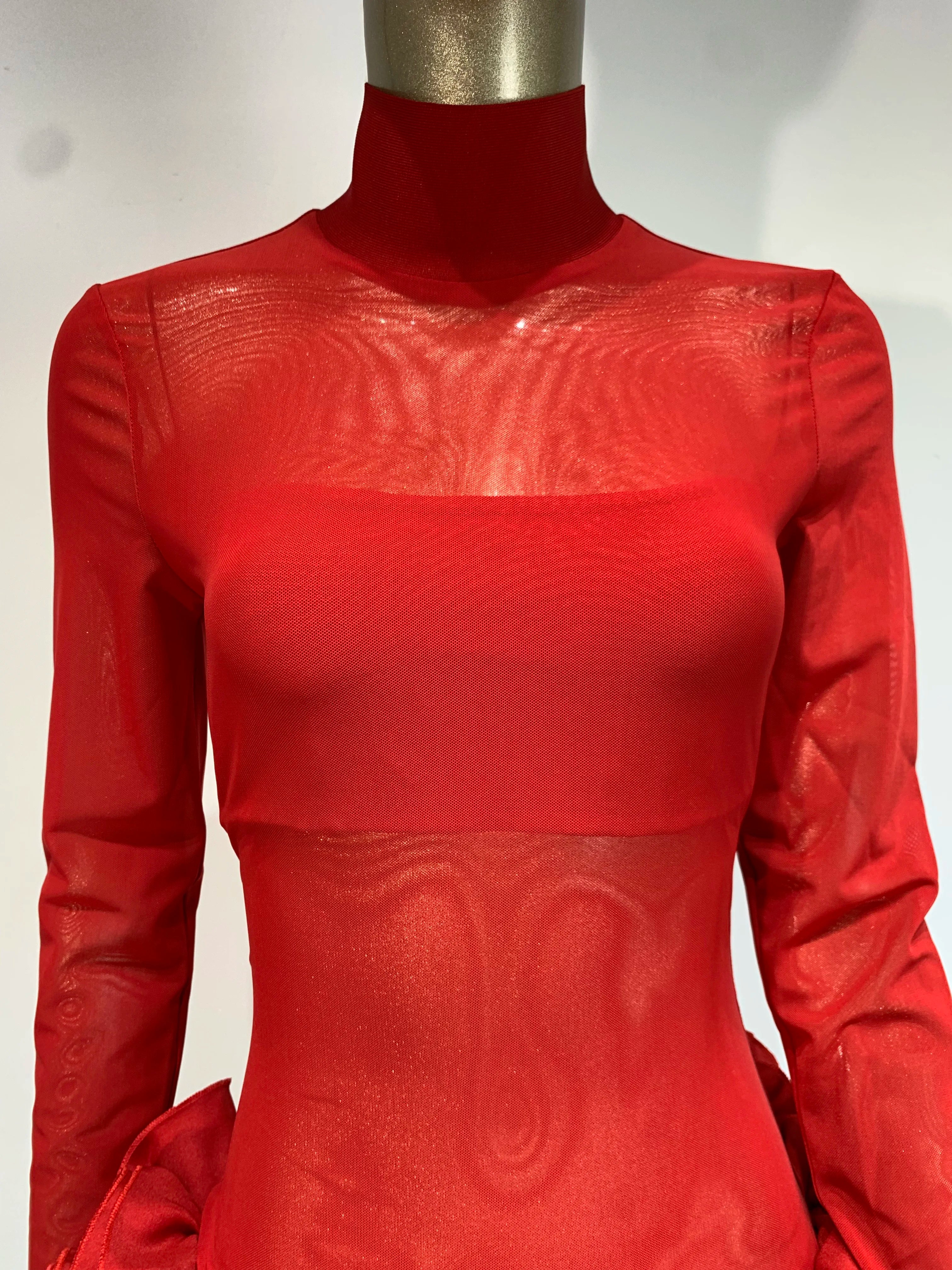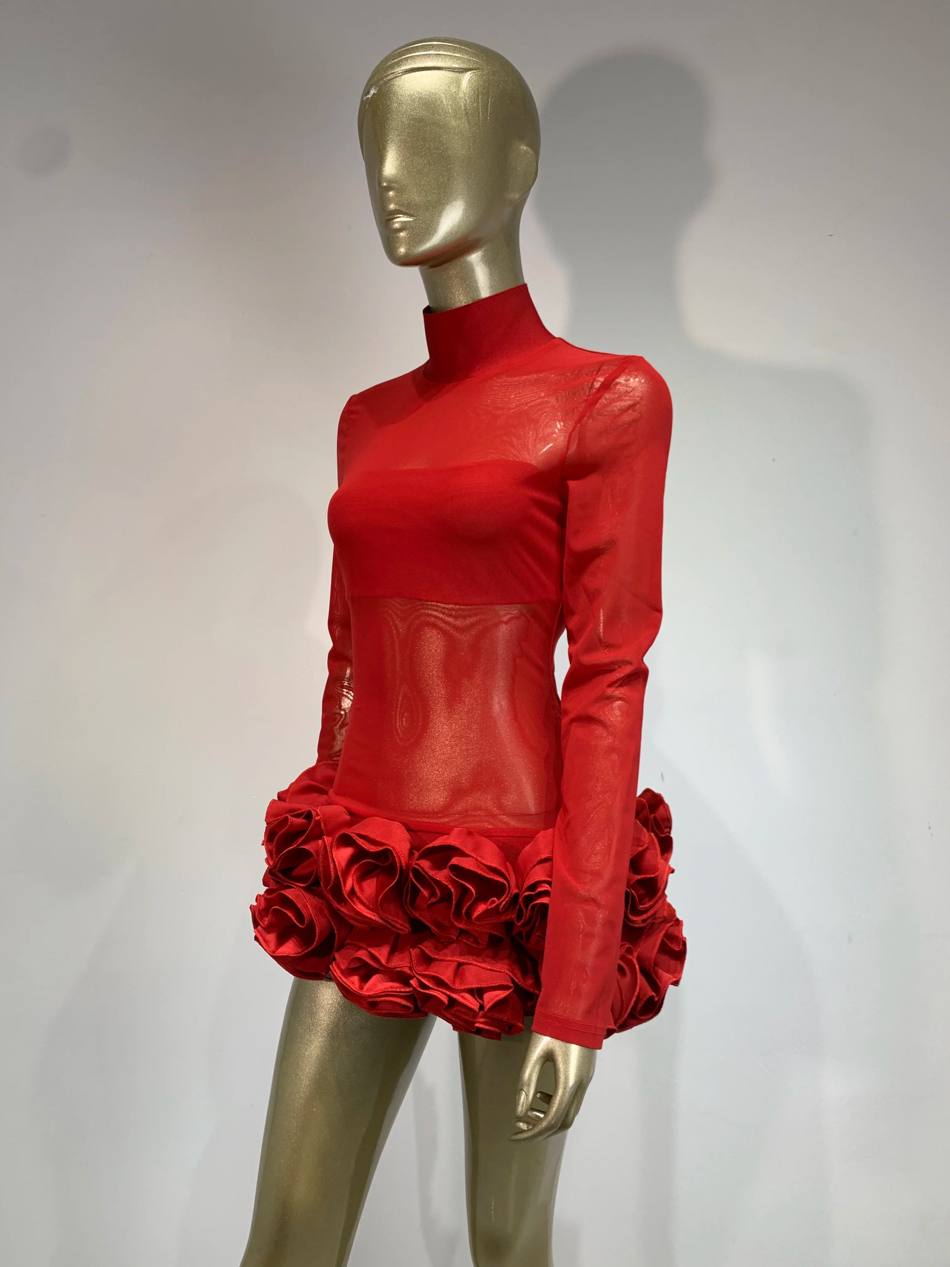 This luxury mini dress is a perfect choice for formal events or parties. It features a form – fitting silhouette with sheer panels and bold 3D floral accents, enhancing the wearer’s glamour.