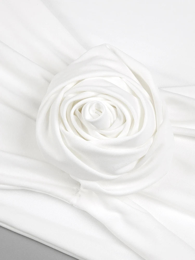 - Skirt Design: High slit, side ruching, 3D floral appliqué on the side