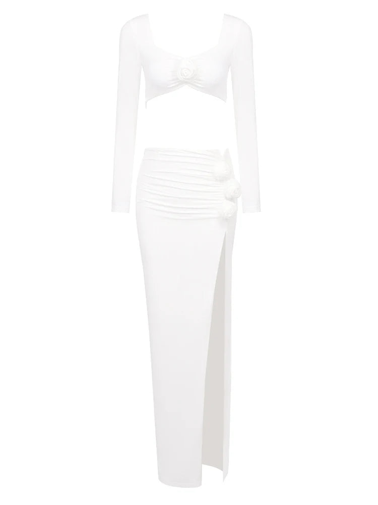 - Top Design: Square neckline, long sleeves, 3D floral appliqué on the bust, cropped hem