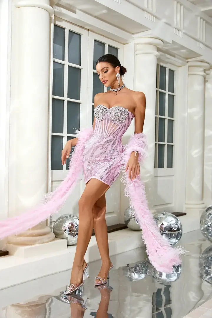 Indulge in luxury with this exquisite evening cocktail dress paired with a feathered stole. Ideal for formal events and glamorous occasions, it offers a form – fitting silhouette and high – end craftsmanship for a captivating look.