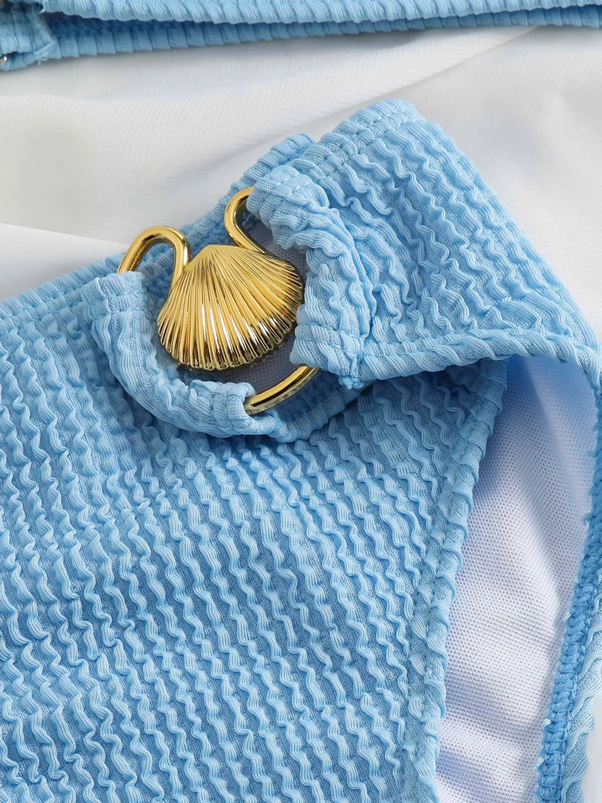 • Design features: The top has an asymmetric V – shaped neckline with a centered cutout hemline and a gold shell – shaped ring. It’s a bandeau – style, sleeveless top. The bottom is a high – cut bikini brief.