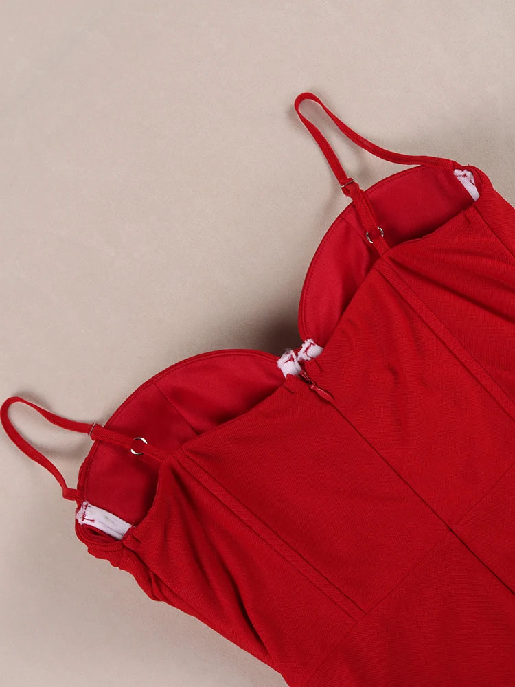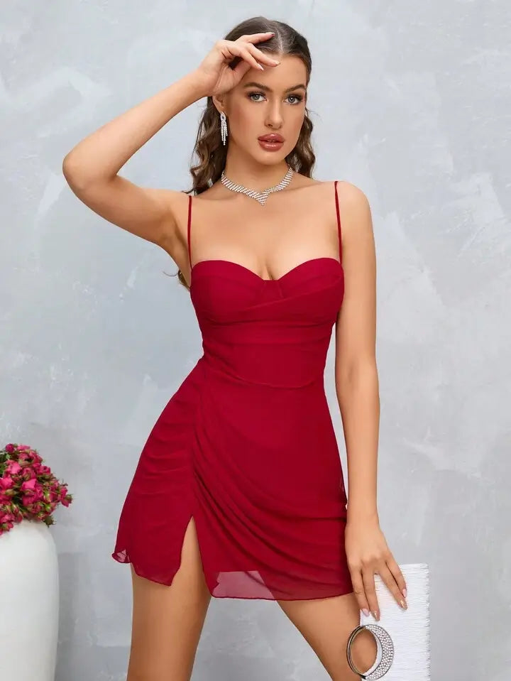 - Structural Elements: Spaghetti straps with metal adjusters, structured bust cups, draped front panels, side slit on the skirt, and a back zipper