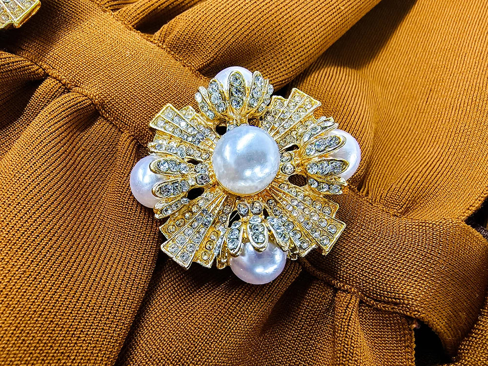 - Decorative Elements: Three large, floral brooches on the front (gold – toned metal, adorned with pearls and crystals)