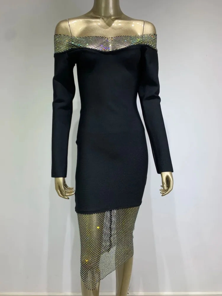 The off – shoulder neckline and long sleeves create an elegant look, and the sheer metallic skirt overlay gives it a glamorous edge.