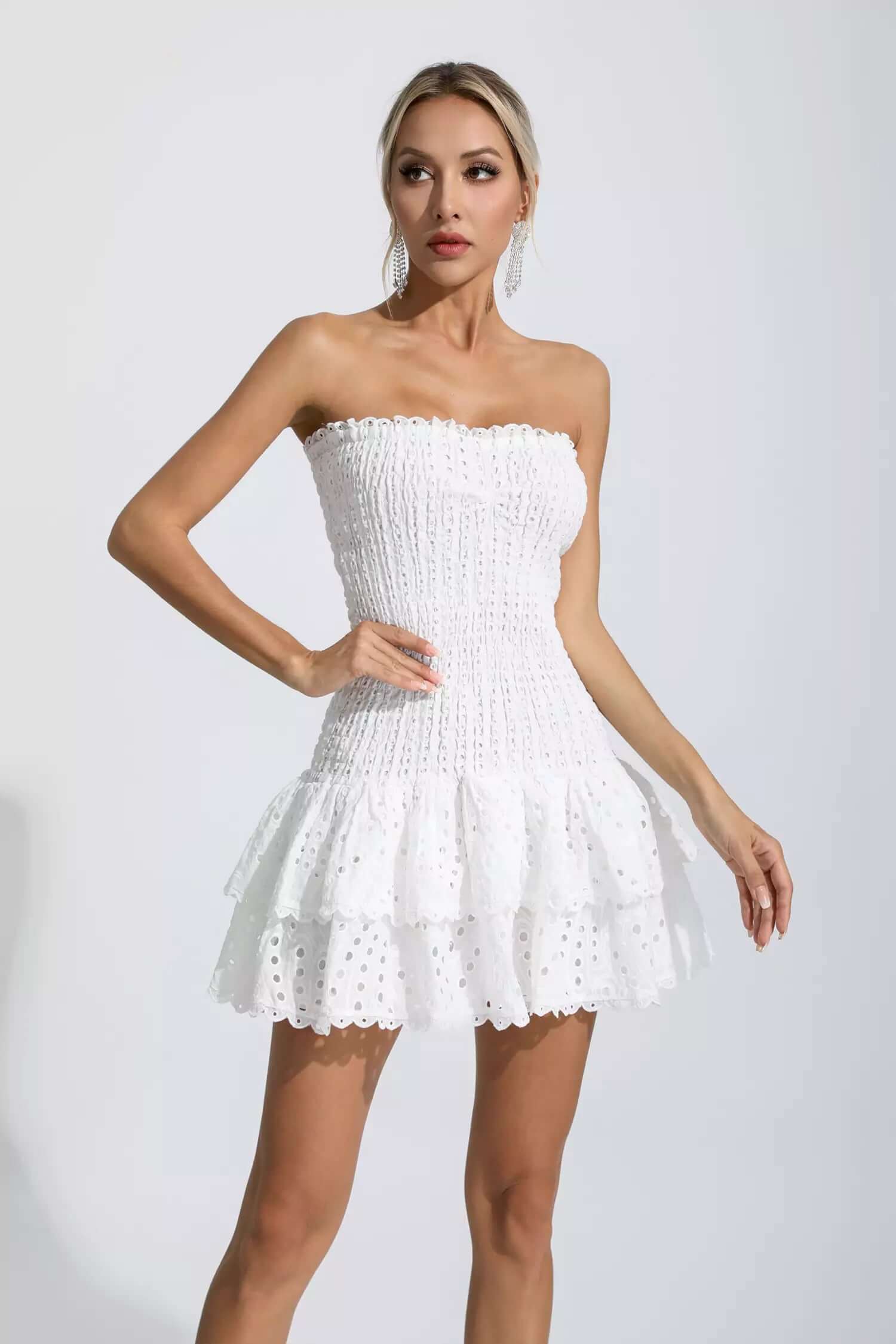 This white mini dress is a perfect blend of romance and summer charm. It features an eyelet embroidery pattern, adding a delicate and vintage touch. The tiered ruffled hem and smocked bodice create a feminine and playful look.