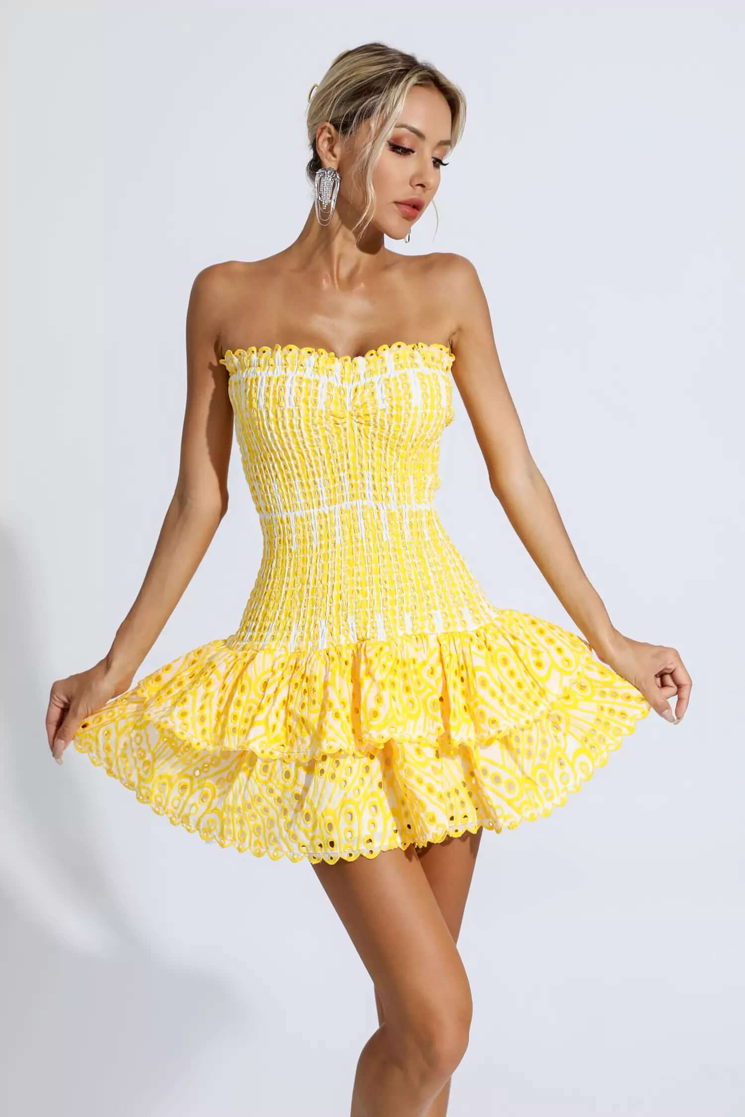 - Design features: Strapless neckline, sleeveless, tiered ruffled hem with two distinct layers, smocked bodice, and eyelet embroidery on the skirt