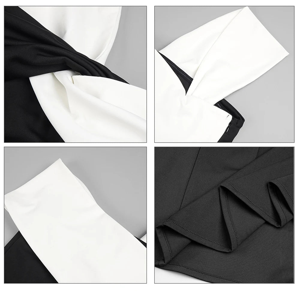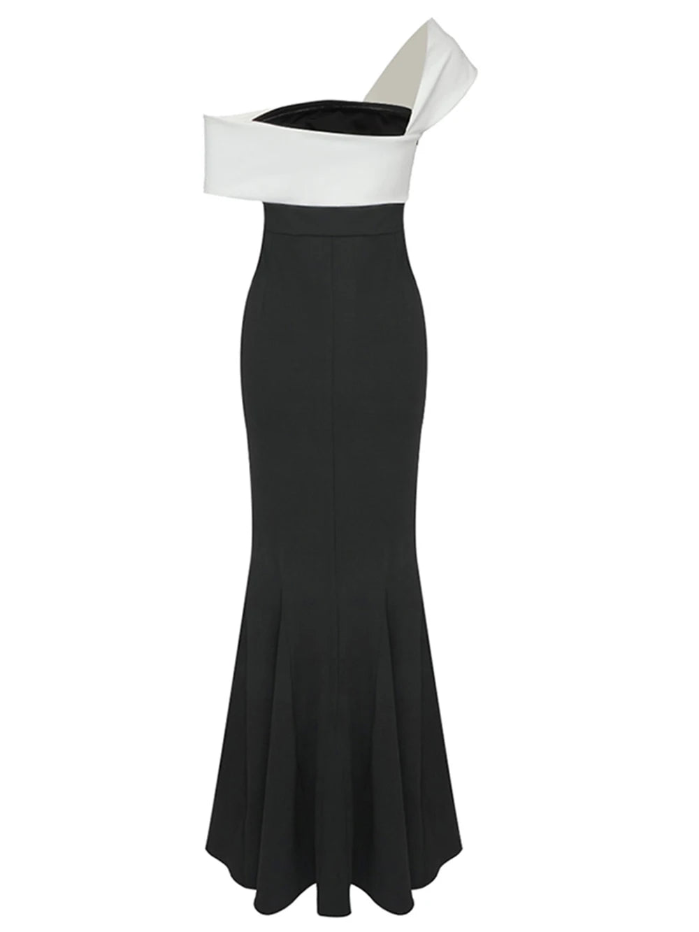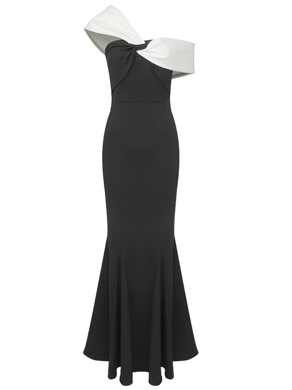 - Design Detail: Off – the – shoulder white panel draping over the shoulder with a twisted knot at the chest