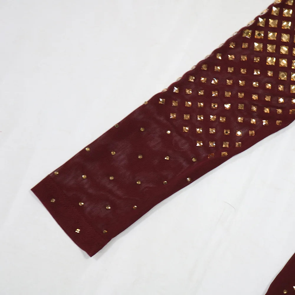 - Embellishments: Rhinestones/beads in diagonal grid pattern on upper torso and scattered dots on lower body
