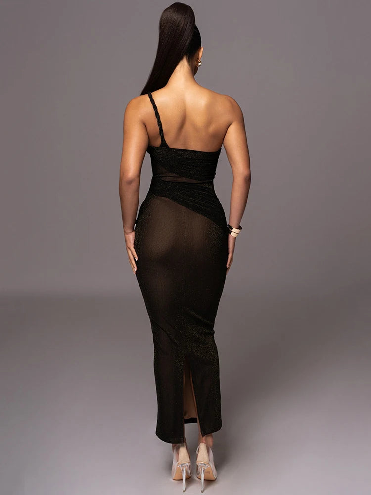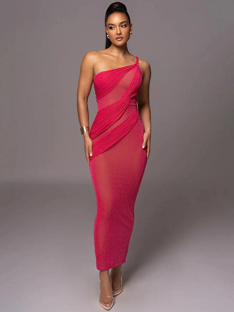 Indulge in the allure of this luxury one-shoulder evening dress. Its form-fitting silhouette accentuates your curves, while the shimmering fabric and elegant design make it perfect for formal and glamorous occasions.