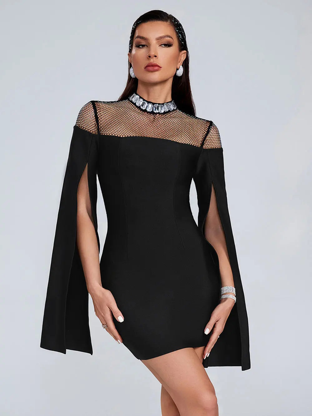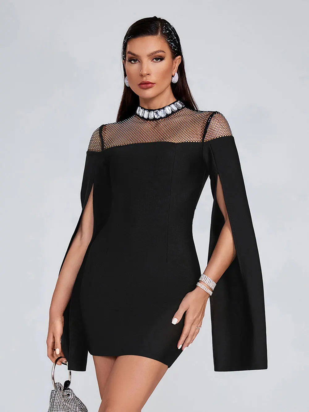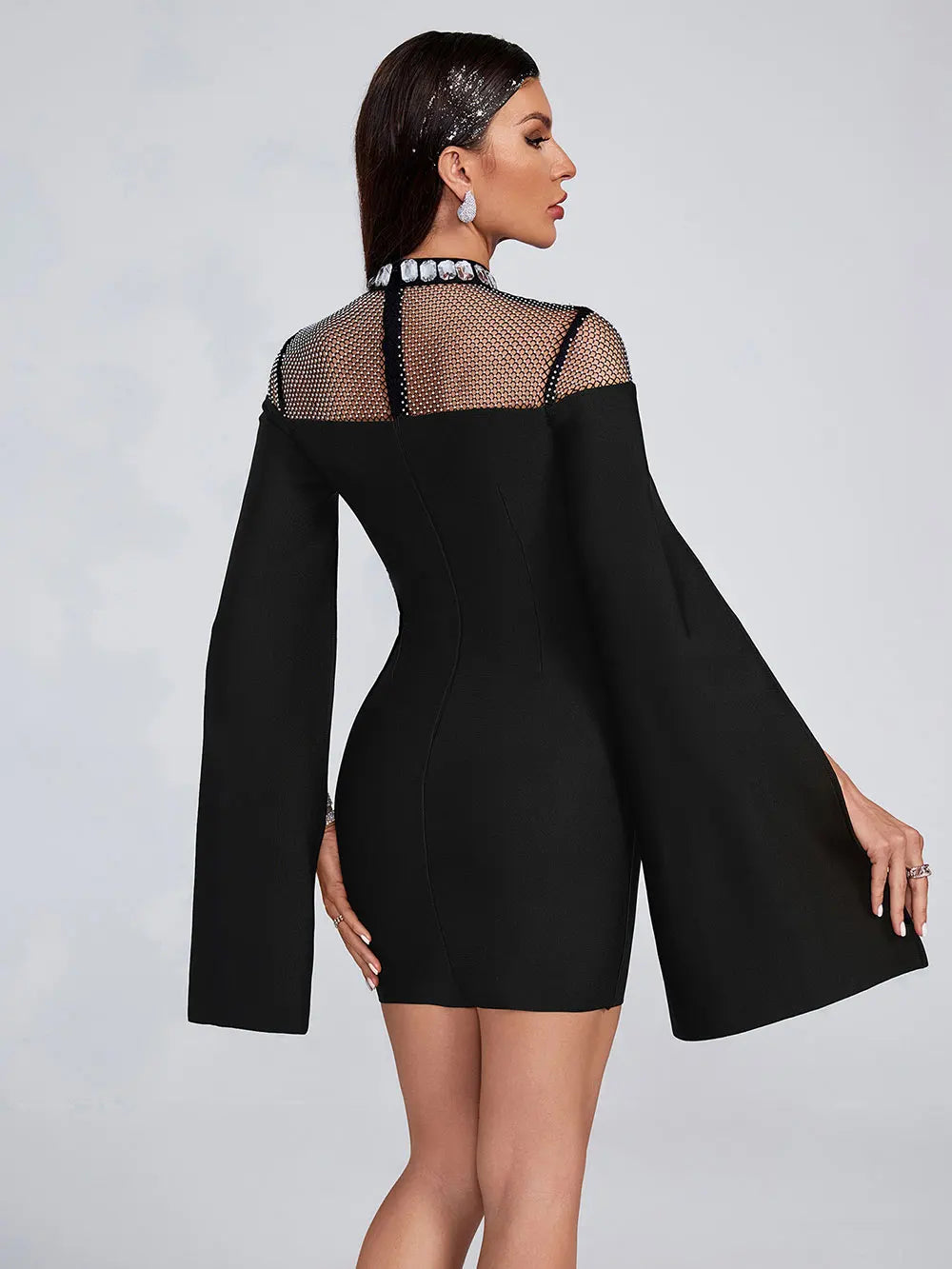 - Neckline: High, sheer mesh panel with a rhinestone – encrusted collar