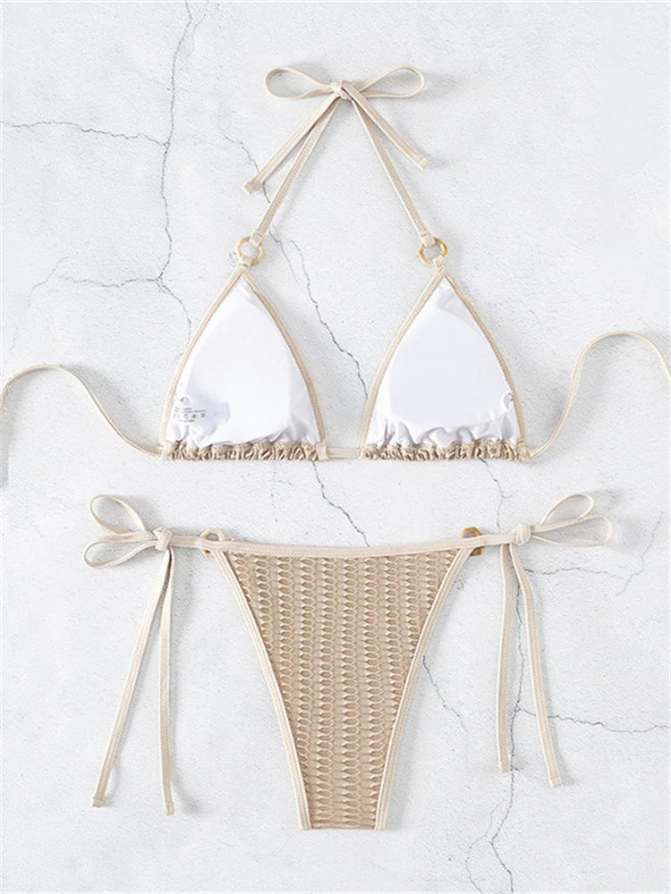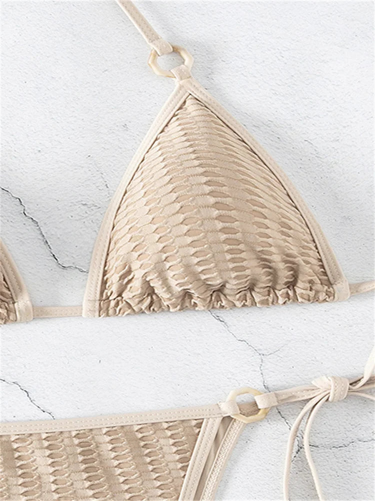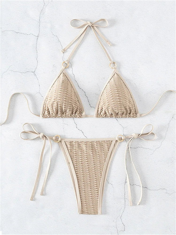 This two-piece bikini is a stylish addition to your swimwear collection. It features a solid beige color, offering a neutral and warm undertone. The top is halter-style with a crisscrossed or tied back, while the bottom has an asymmetric high-cut design with adjustable side ties and a textured grid pattern.