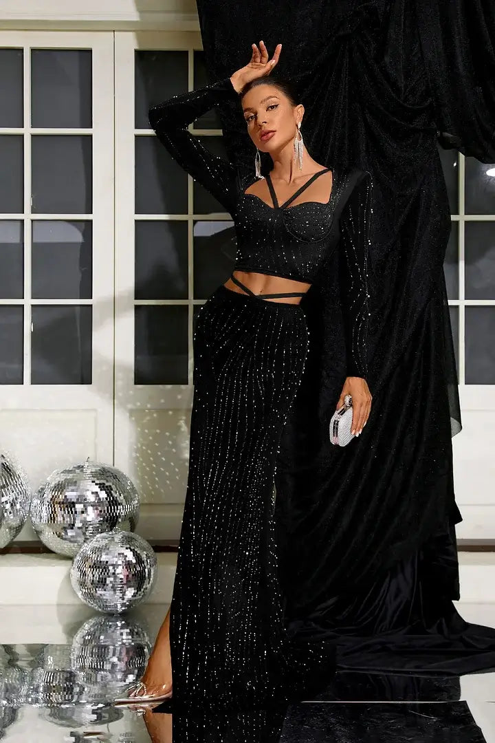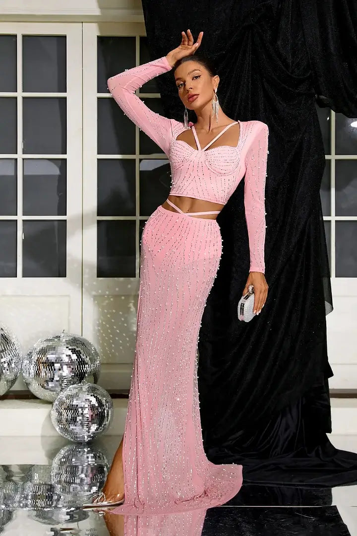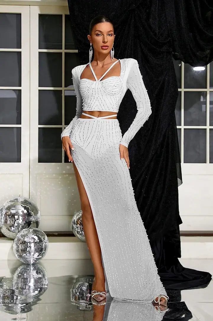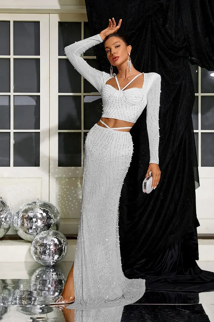Indulge in luxury with this exquisite two-piece formal wear set. Ideal for glamorous events, it combines style and comfort with its form-fitting design and high-quality construction. The sparkling embellishments add a touch of elegance, making you stand out in any crowd.