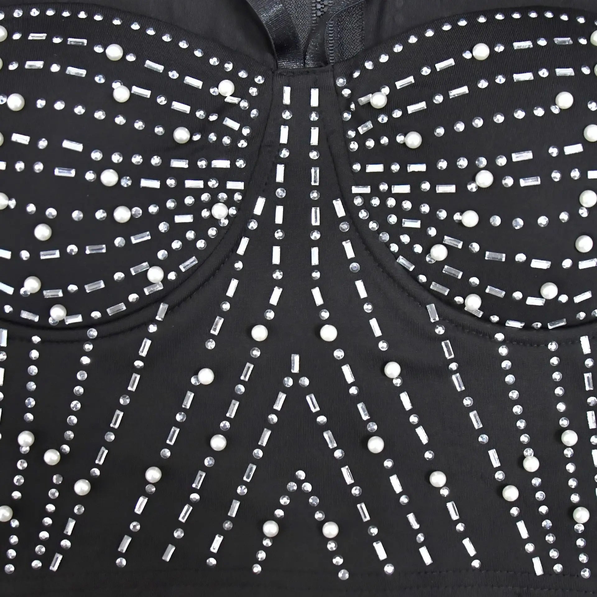 - Embellishments: Vertical lines of white pearls and clear rhinestones/crystals