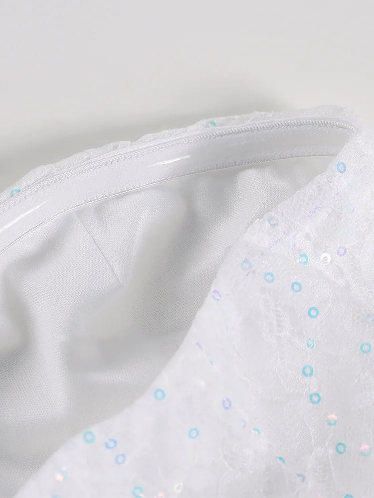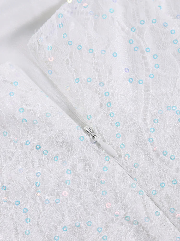 This exquisite dress is a perfect choice for special occasions. Its delicate lace and sparkling sequins add a touch of glamour, while the structured design ensures a flattering fit.