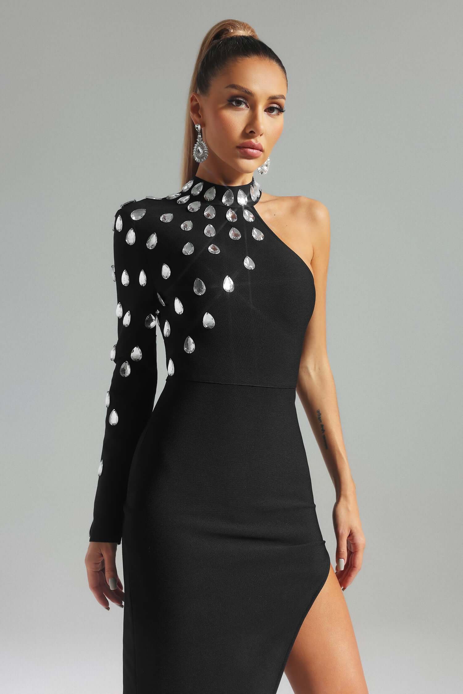 This midi dress is a stunning piece that combines glamour and edge. It features a solid black base with silver teardrop rhinestones as accents, creating a bold and sophisticated look. The asymmetric one – shoulder design and high side slit add a touch of drama, making it perfect for formal events.
