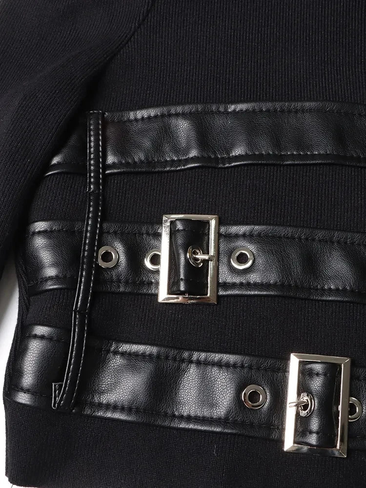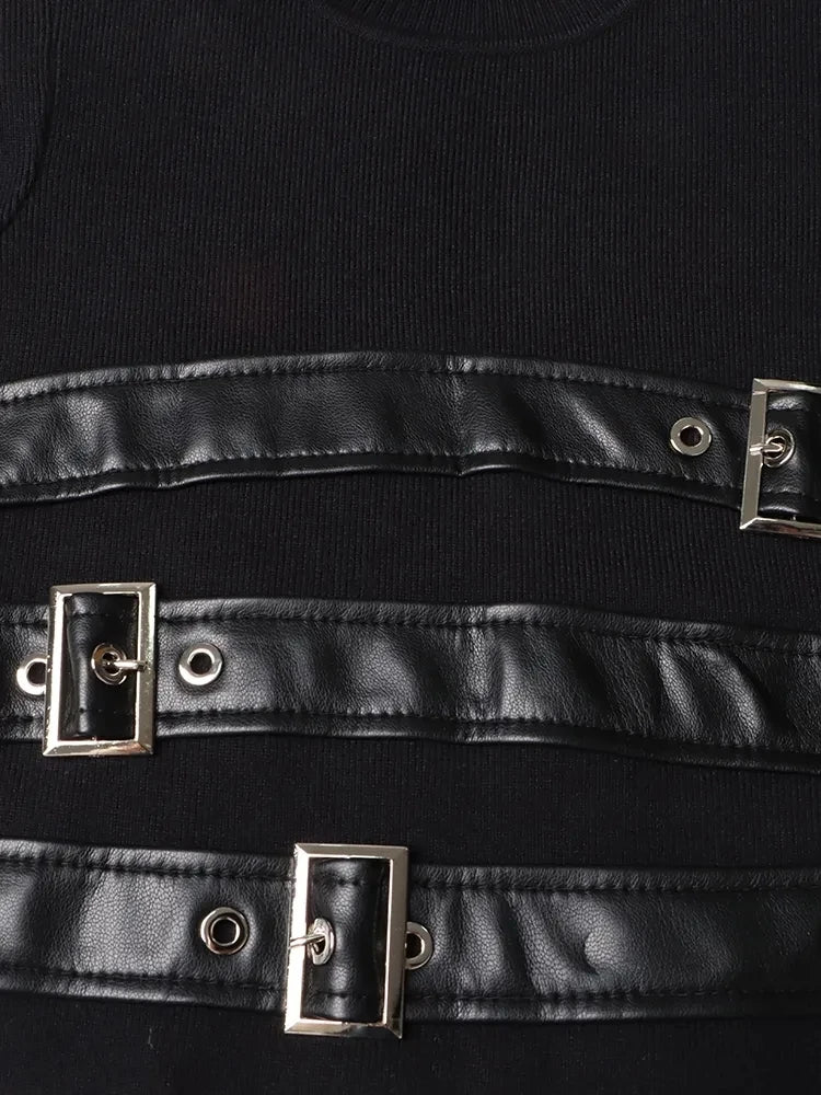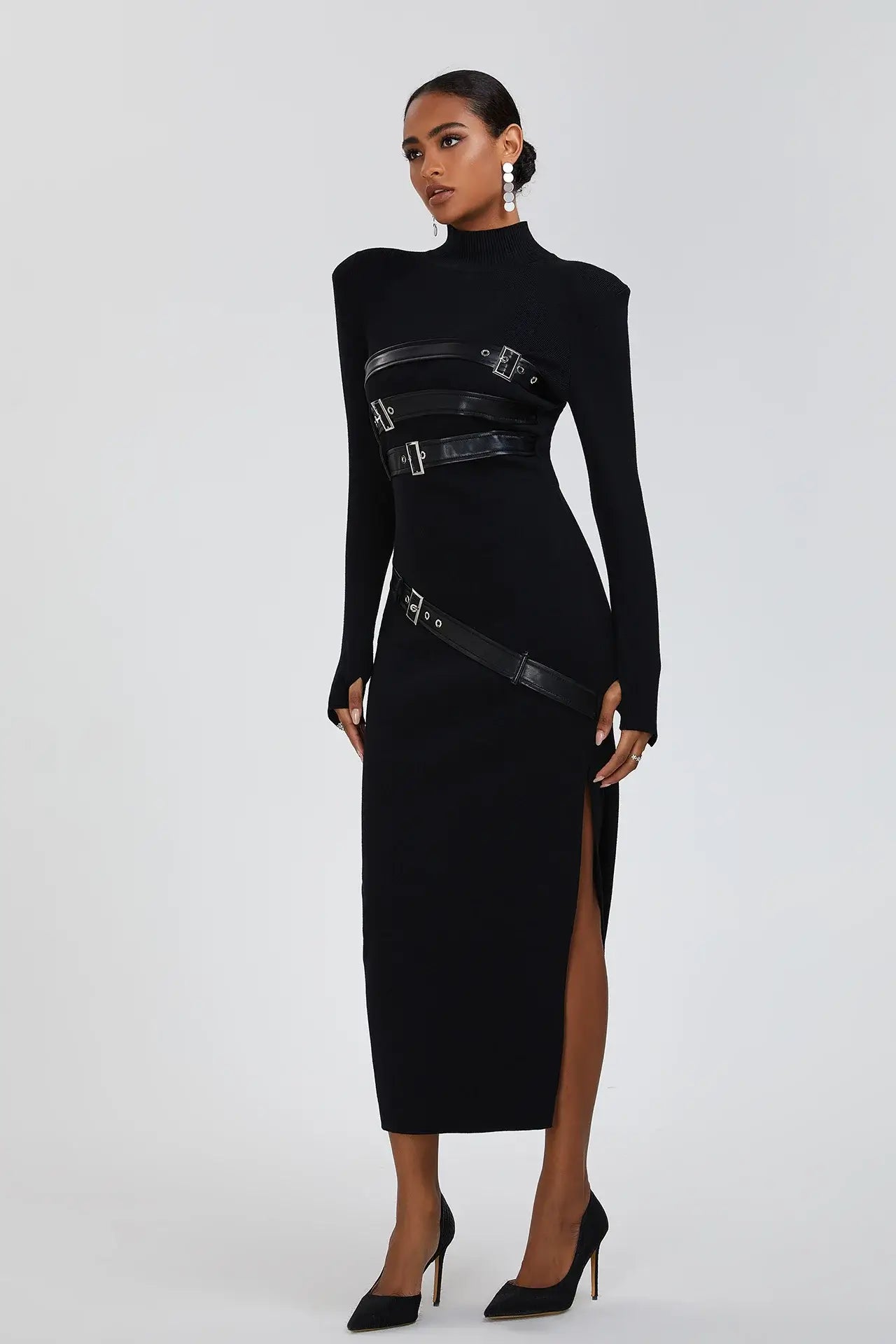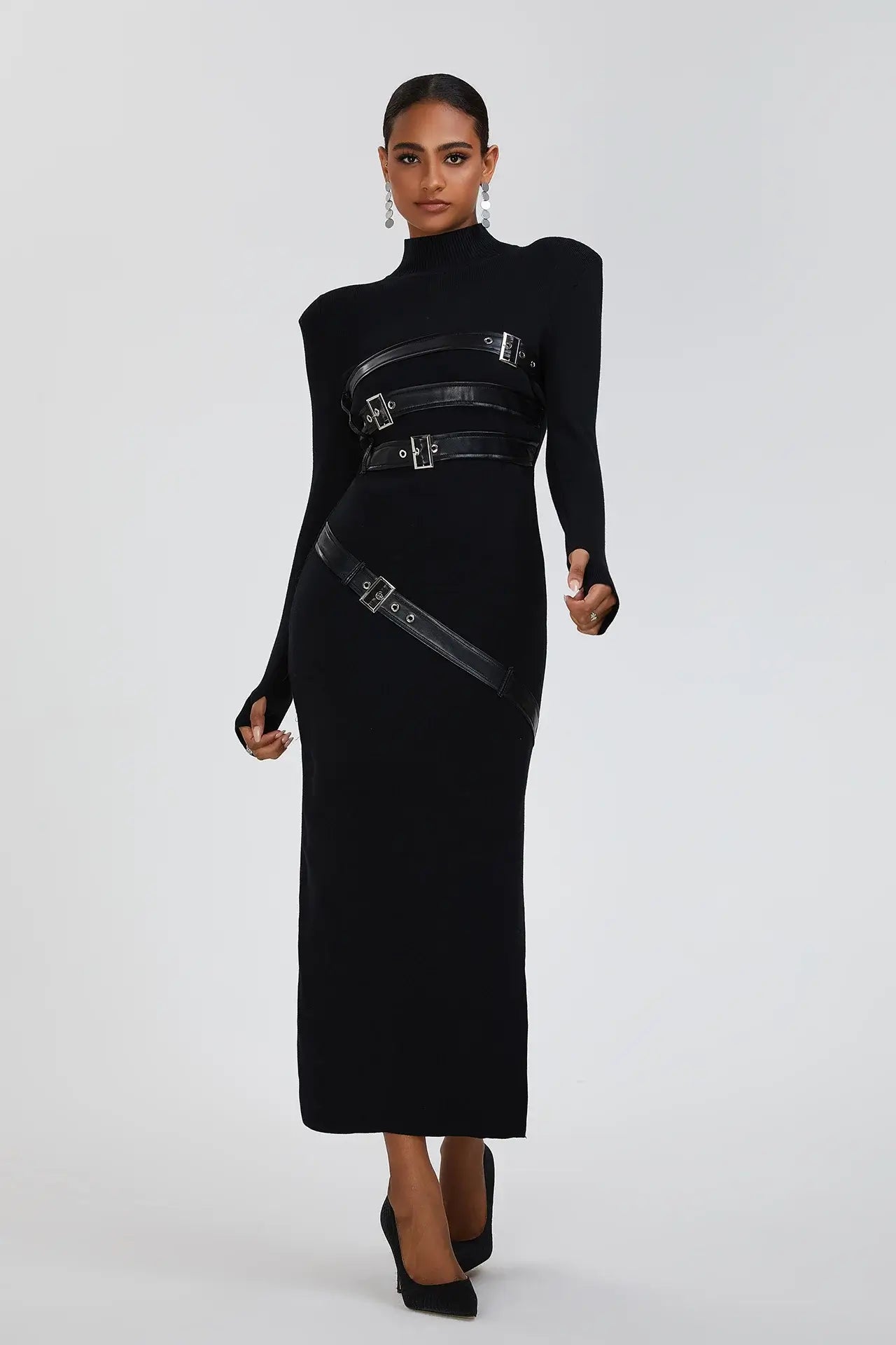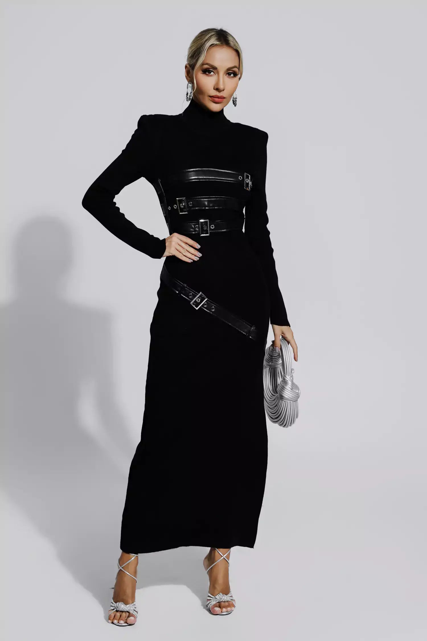 - Leather Straps: Multiple black leather straps with silver metal buckles