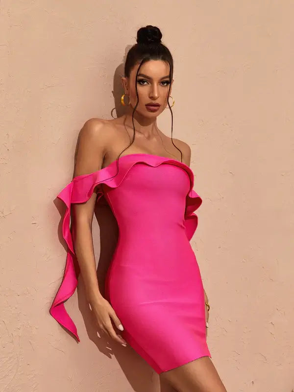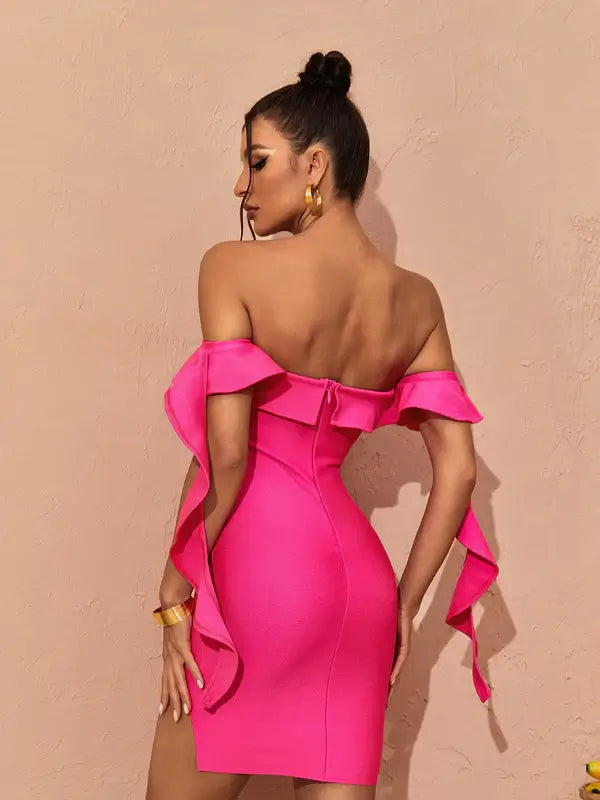 - Neckline: Off – the – shoulder with a ruffled, wide trim
