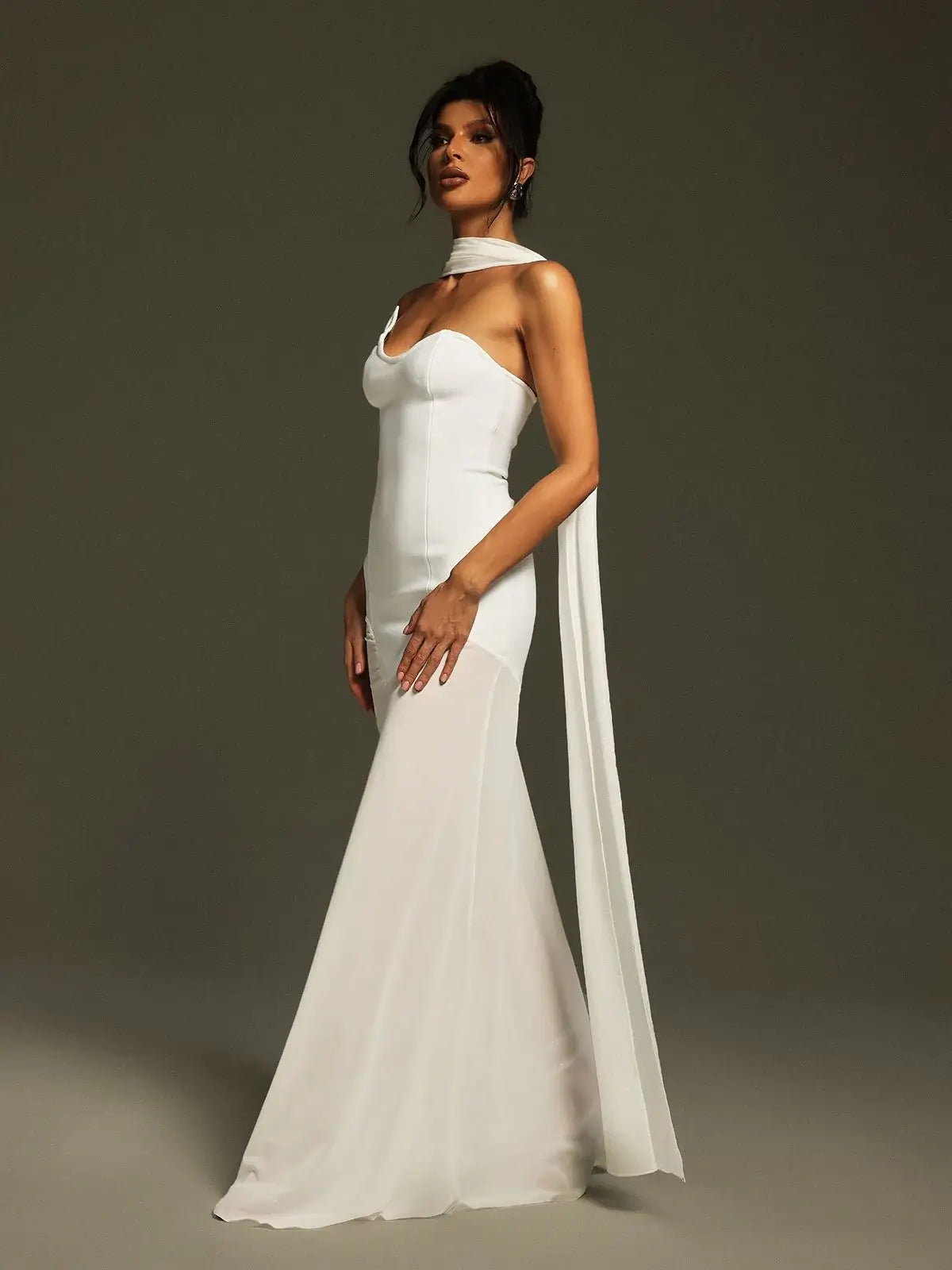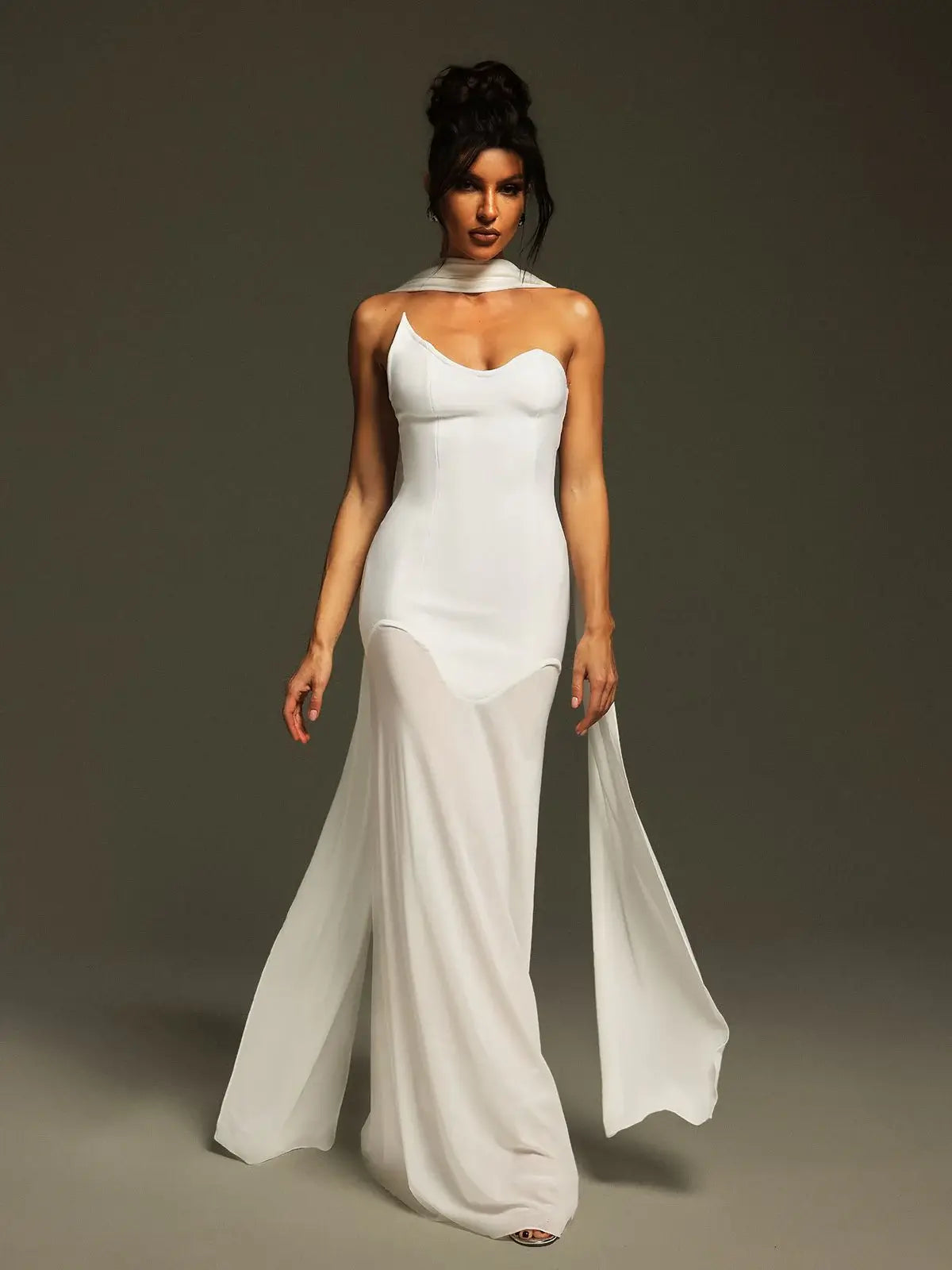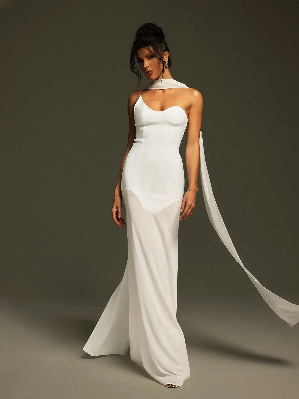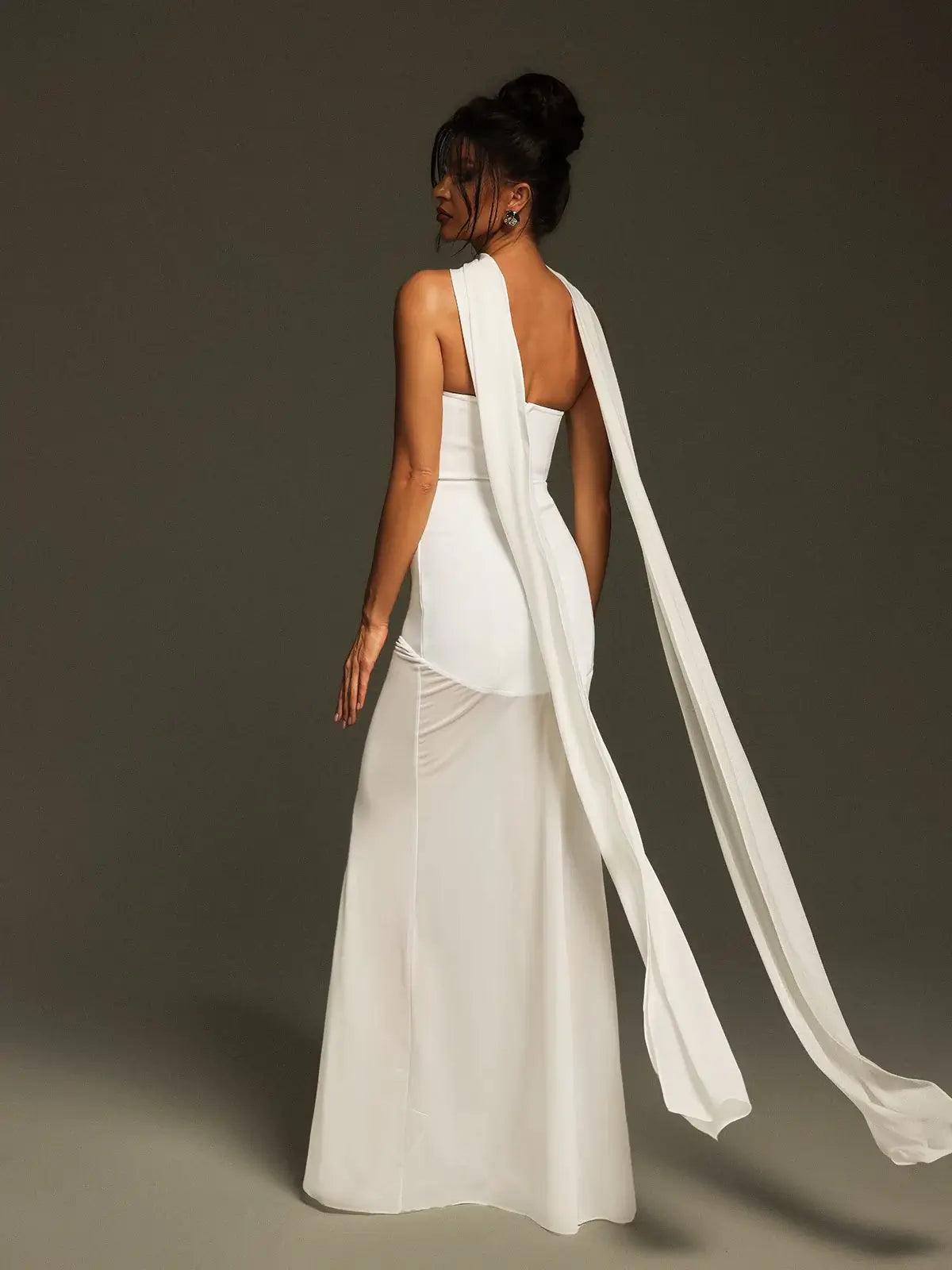 - Draped Back/Neck Details: Long, flowing fabric straps/tails in white dresses