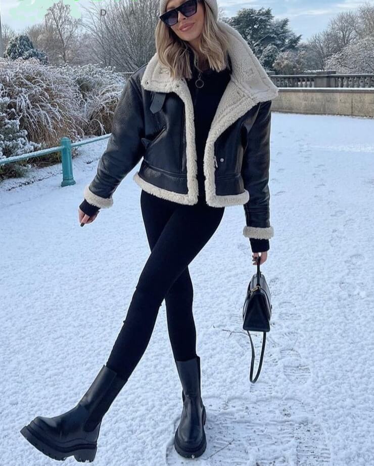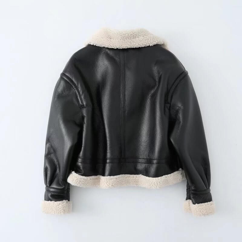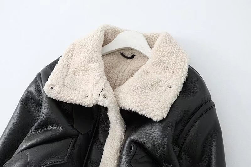 - Fabric characteristics: Made from smooth, grainy textured black leather with a structured, non – stretchy feel. The collar is lined with plush, soft shearling/faux fur.