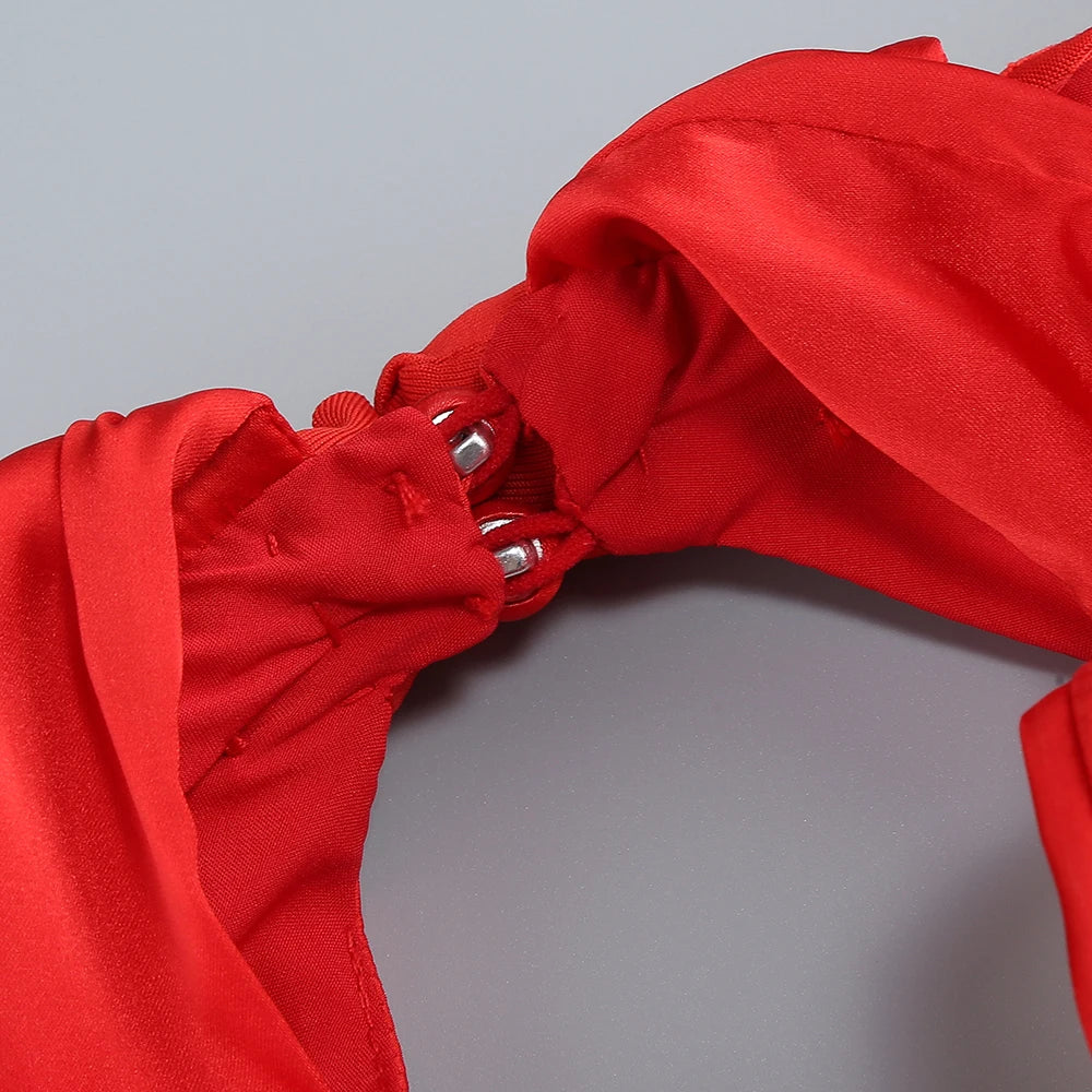 Make a bold statement with this solid, vibrant red dress. Crafted from smooth, shiny satin, it features puffed cap sleeves and a structured bodice with tailored details, perfect for formal events.