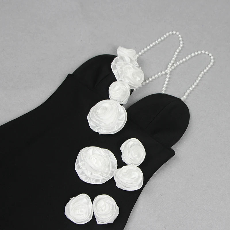 - Floral Arrangement: White 3D flowers cascade diagonally from the bust to the hip/side