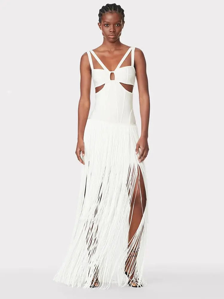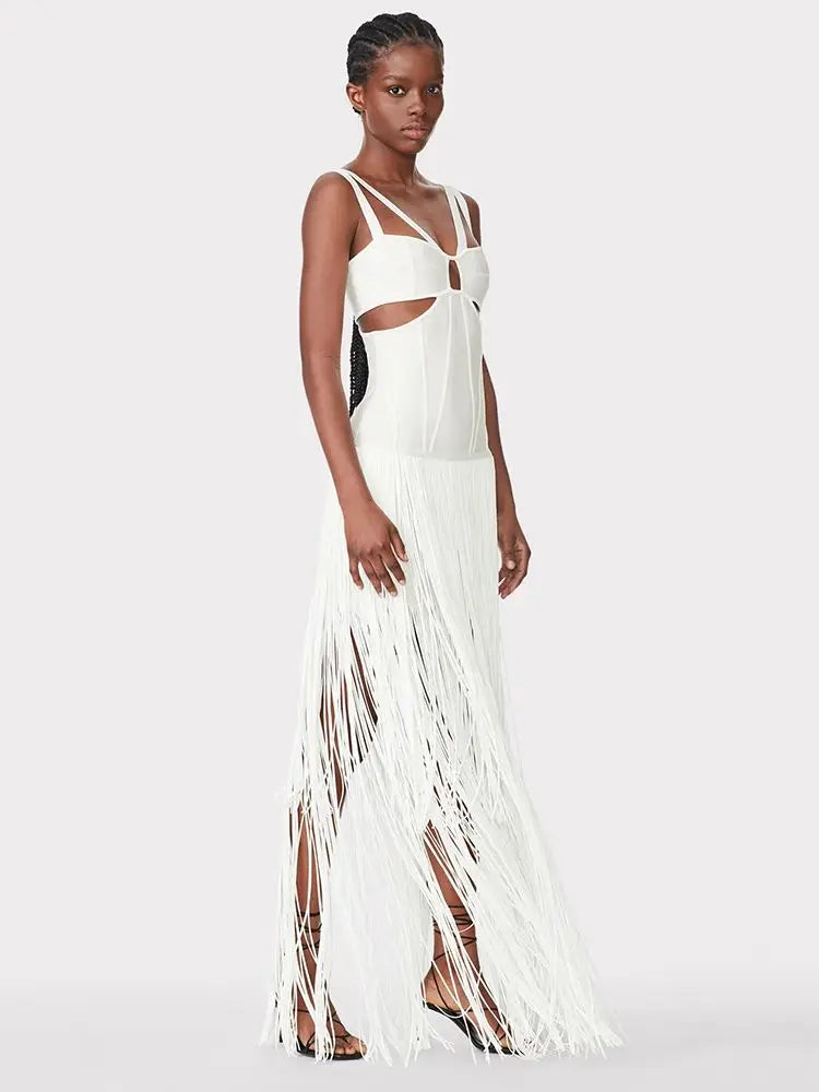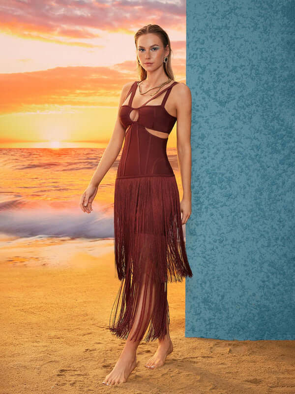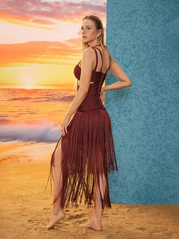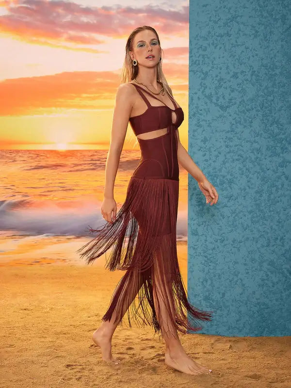 Indulge in the elegance of this luxury fringed formal dress. It offers a form – fitting silhouette that accentuates your curves, making you stand out at semi – formal events or beachside gatherings. The flowing fringes add a touch of movement and style.